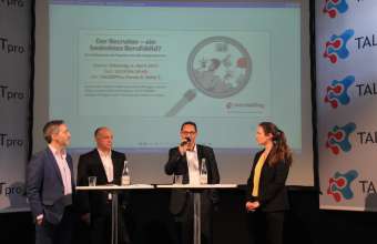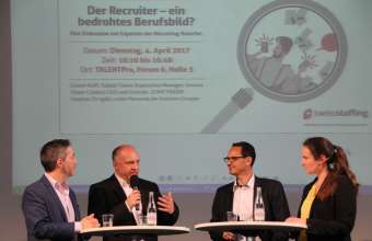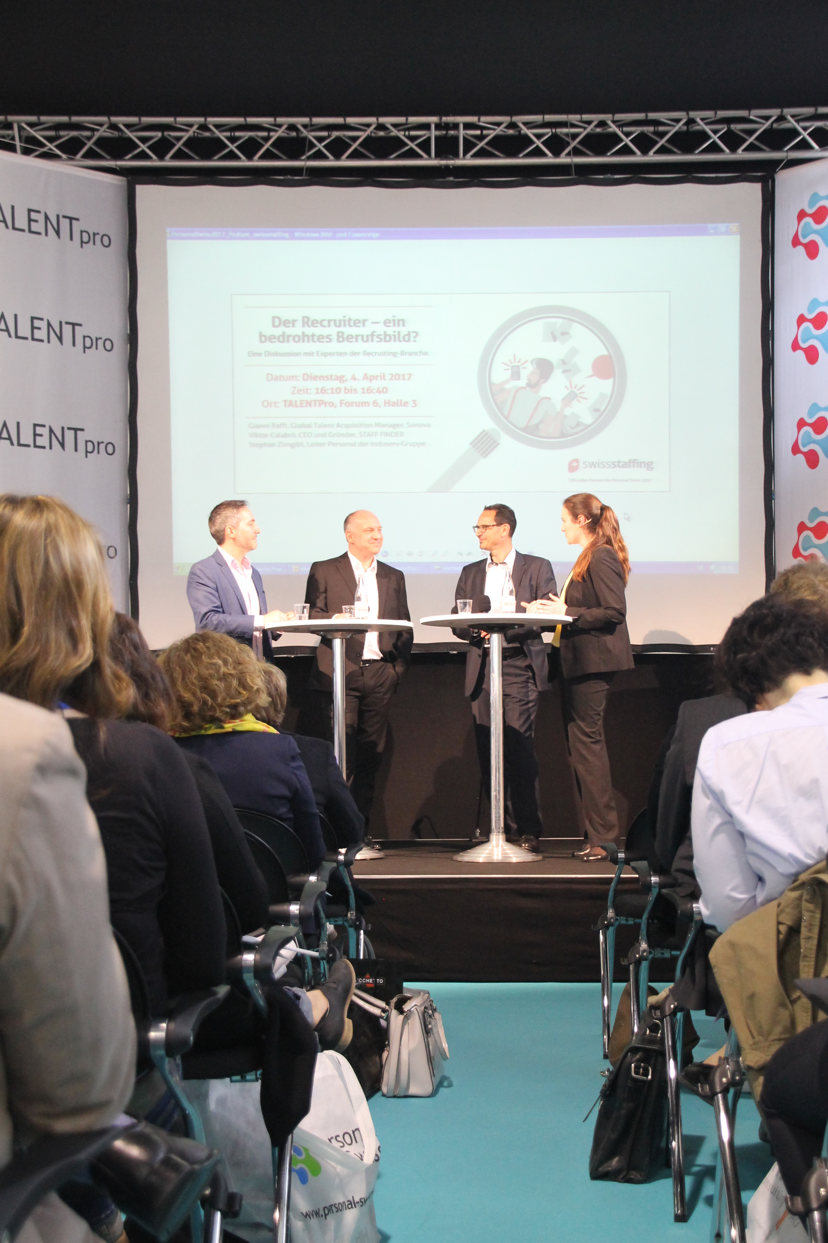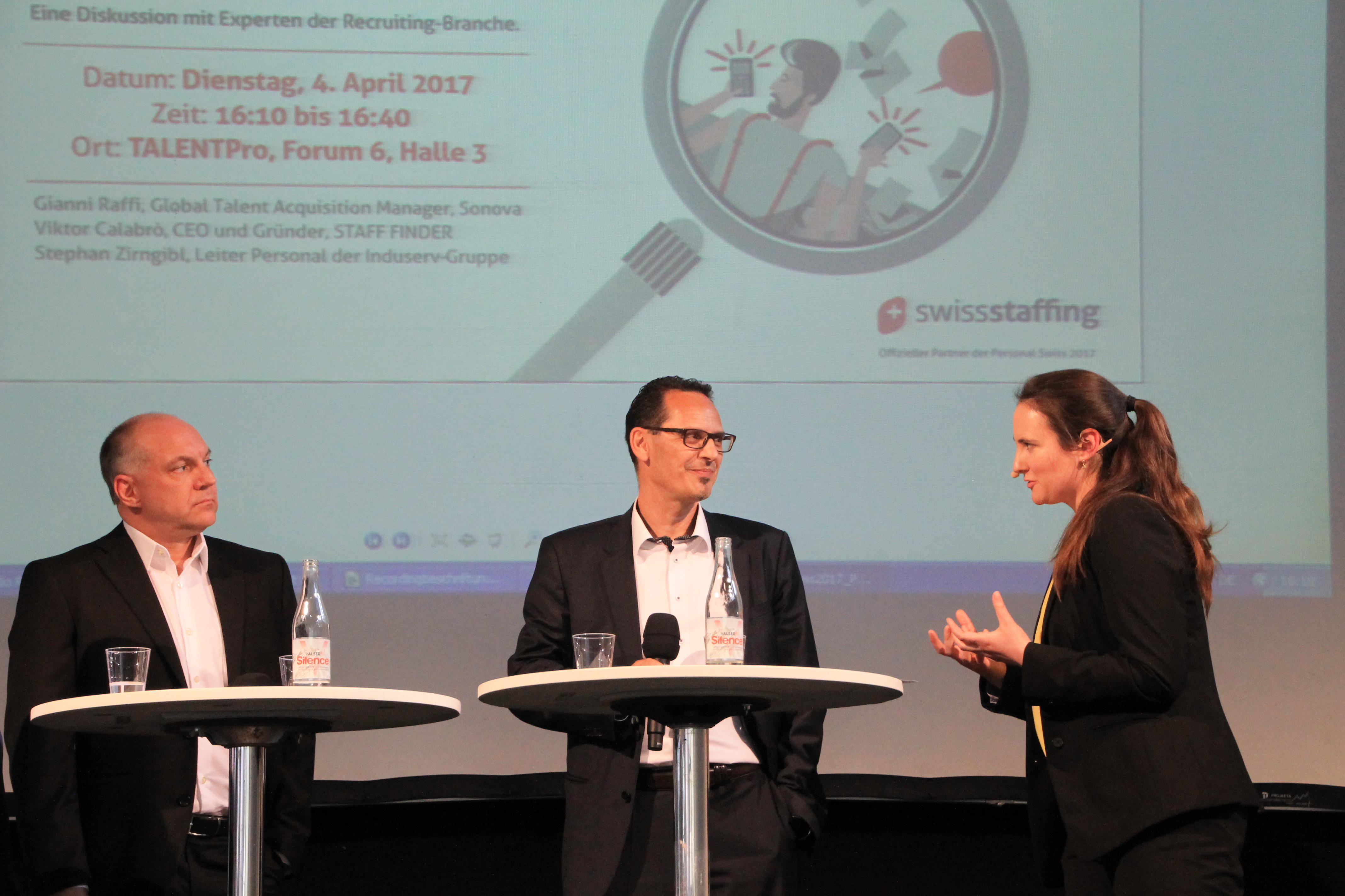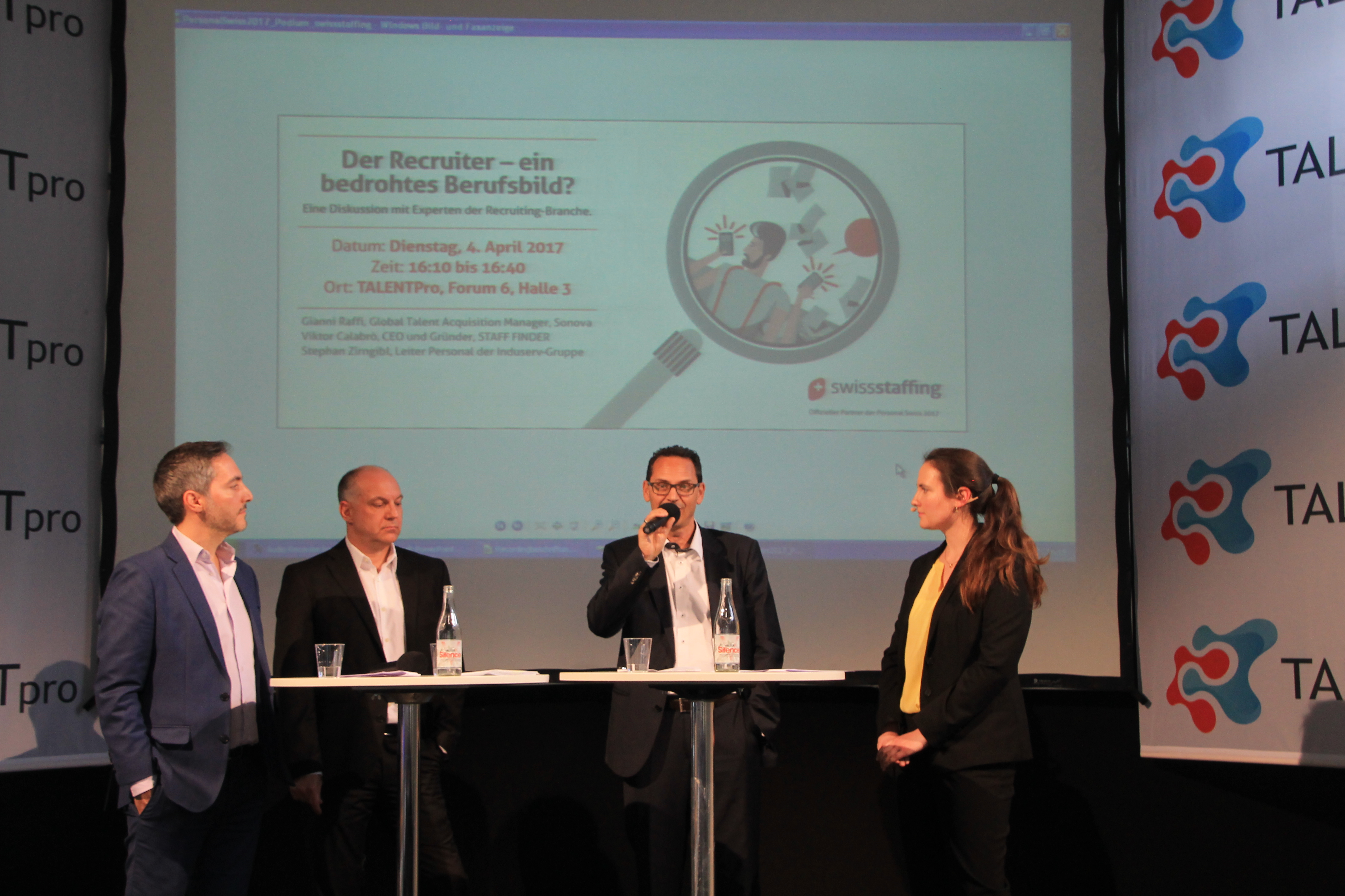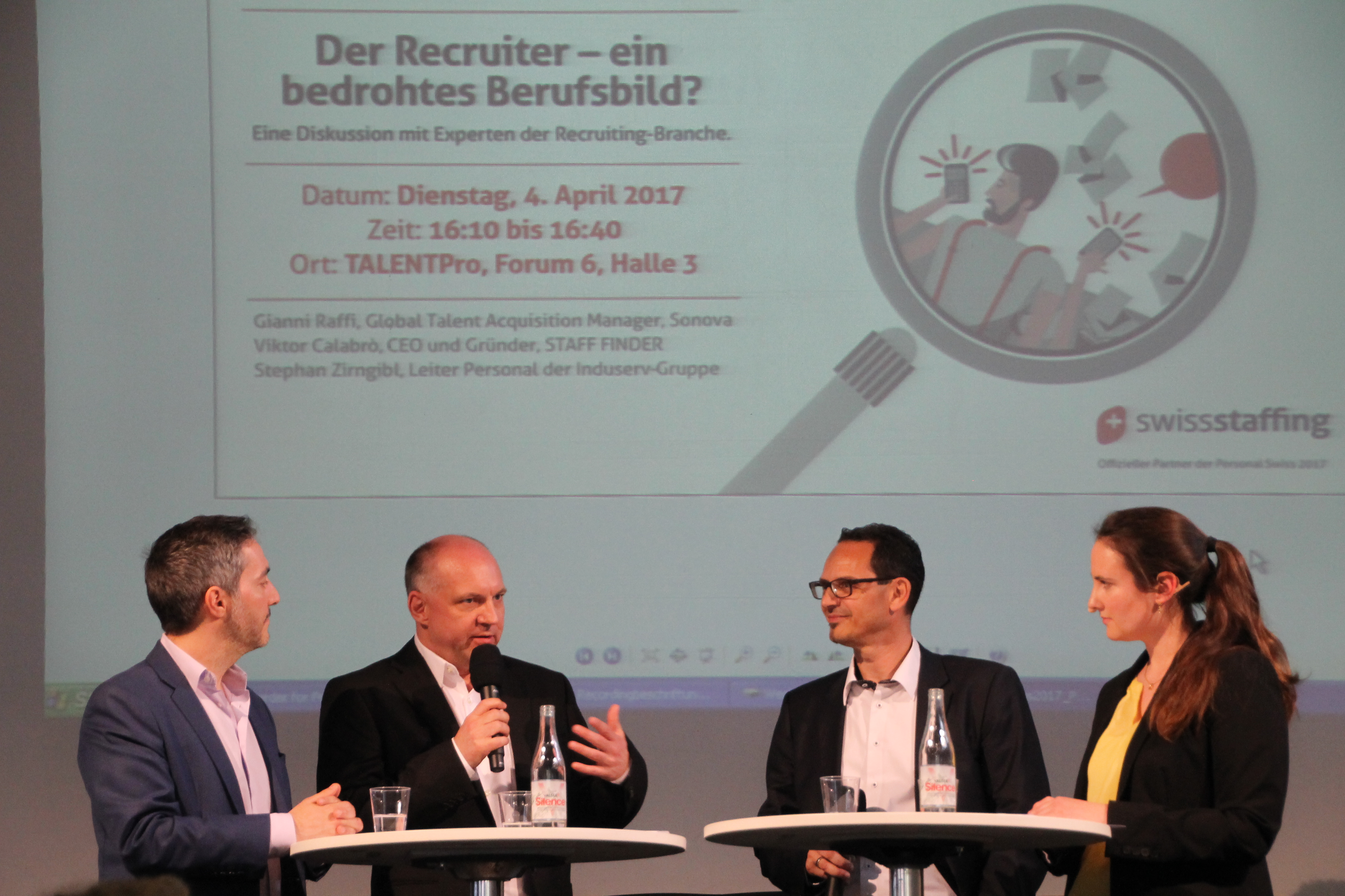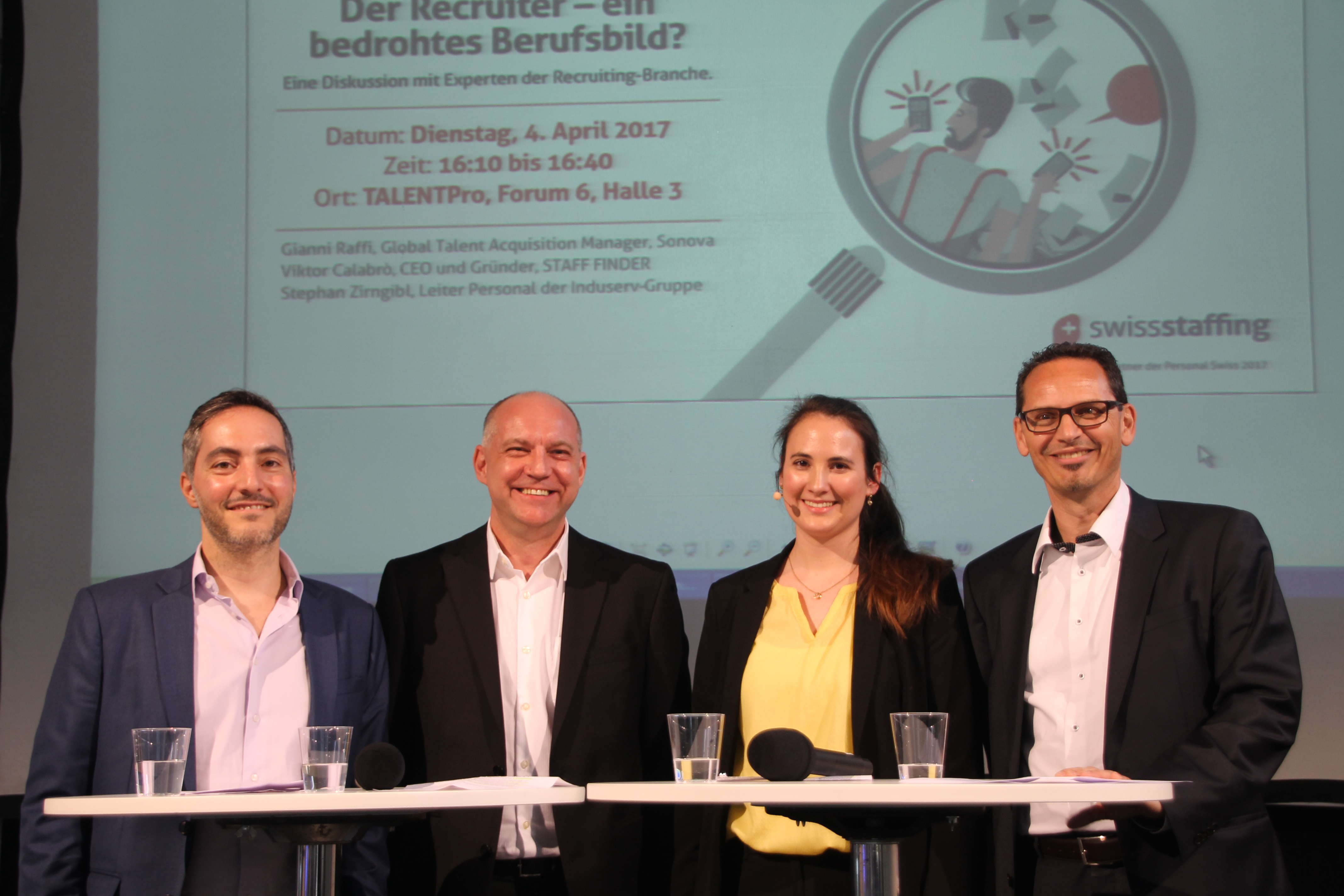 Im Gespräch mit den drei Recruiting-Experten Viktor Calabrò (CEO Staff Finder), Gianni Raffi (Global Talent Acquisition Manager, Sonova) und Stephan Zirngibl (Leiter Personal, Induserv Gruppe) stellte swissstaffing gestern an der TalentPro seinen Gästen die Frage: Wie sieht das Berufsbild des Recruiters in Zukunft aus? Wird es ihn in 10 Jahren noch geben?