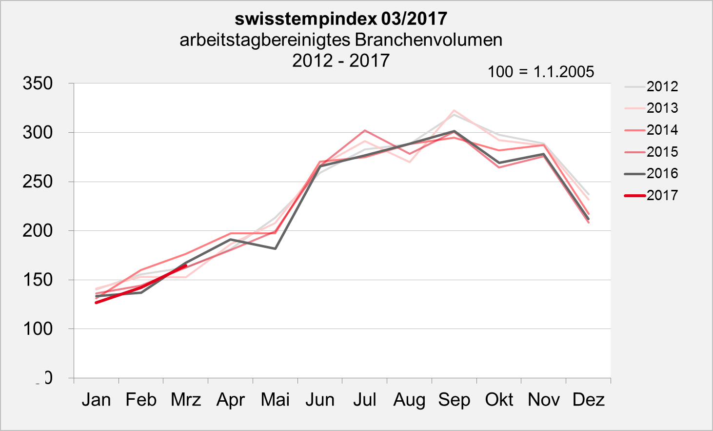 Der swisstemptrend gab im März im Vergleich zum Vorjahresmonat leicht nach. Um 1,7 Prozent ging gemäss dem Branchenbarometer die arbeitstagbereinigte Geschäftstätigkeit zurück. Da der März aufgrund der späten Osterfeiertage in diesem Jahr 23 Arbeitage zählte, liegt das nicht werktagsbereinigte Wachstum seit Jahresbeginn 2,6 Prozent im Plus. In den letzten 12 Monaten konnte die Branche ebenfalls eine leichte Steigerung von 0,4 Prozent verzeichnen.
