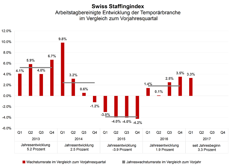 Im Jahr 2016 vermittelten die Schweizer Temporärunternehmen 1,9 Prozent mehr Einsatzstunden. Das zeigt der vom Branchenverband swissstaffing neu lancierte Swiss Staffingindex. Dahinter stehen die Geschäftszahlen von rund 200 Schweizer Temporärunternehmen. Mit 3,3 Prozent mehr gearbeiteten Stunden im ersten Quartal 2017 deutet der Swiss Staffingindex für 2017 eine weitere Beschleunigung der Schweizer Wirtschaft an.
