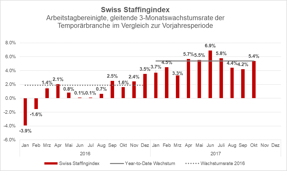 5,4 Prozent. Das ist die Zahl des Monats für die Temporärbranche. Um 5,4 Prozent steigerte sich der gleitende Swiss Staffingindex über die letzten 3 Monate im Vergleich zur Vorjahresperiode. Die Branche wuchs seit Jahresbeginn im Vergleich zum Vorjahr um denselben Wert. Damit setzt sich das dynamische Branchenwachstum der vergangenen Monate fort.