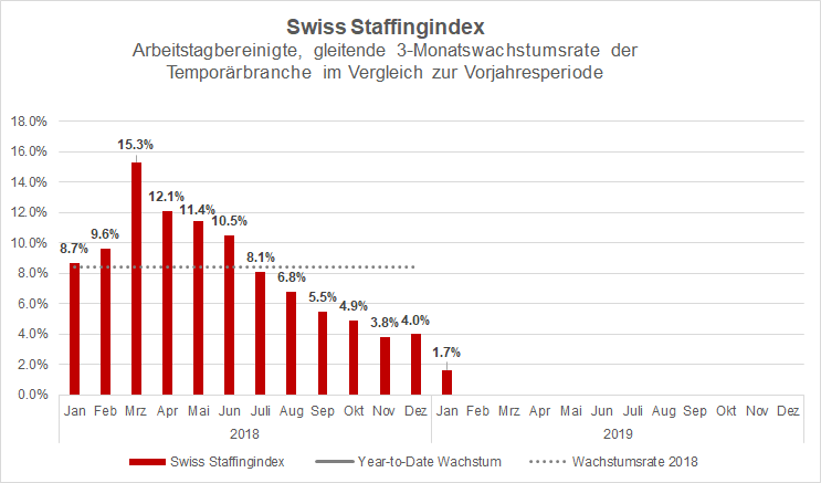 Die schlechten Konjunkturnachrichten im In- und Ausland reissen nicht ab. Dies macht sich auch in der Temporärbranche bemerkbar. Zwischen November bis Januar wuchs die Zahl der Einsatzstunden im Vergleich zur Vorjahresperiode nur noch um 1,7 Prozent. Damit bleibt das Branchenwachstum zwar noch im positiven Bereich, aber befindet sich nach wie vor in einem klaren Abwärtstrend.