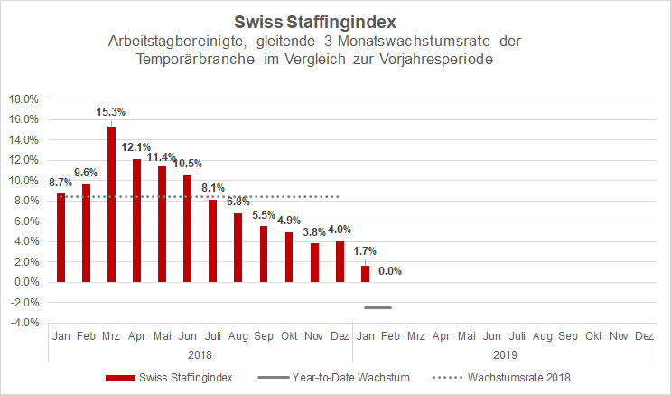 Seit Jahresbeginn hat die Zahl der werktagsbereinigten Einsatzstunden um 2,5 Prozent abgenommen. Der Swiss Staffingindex, der die letzten drei Monate mit dem Vorjahreszeitraum vergleicht, schreibt aufgrund guter Dezember-Werte eine rote Null. Ohne einen überraschenden Anstieg der Geschäftsentwicklung im März dürfte das Wachstum im ersten Quartal negativ ausfallen.
