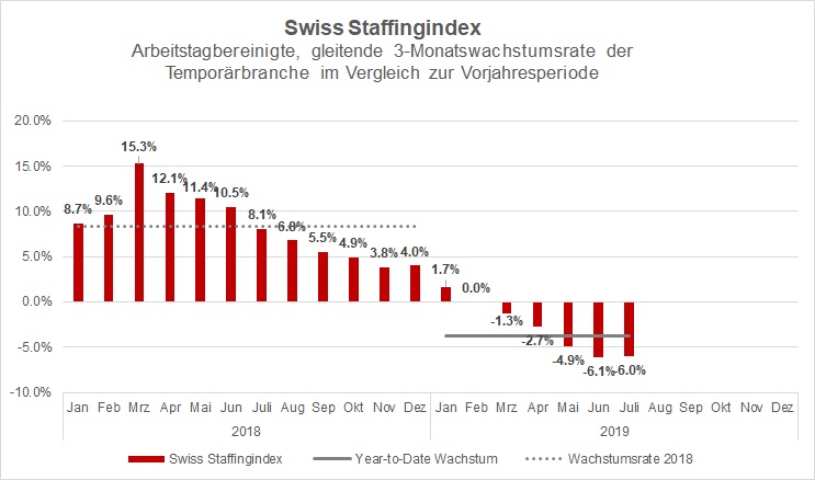Nachdem die Wachstumsrate in den vergangenen anderthalb Jahren Monat für Monat stetig abgenommen hat, könnte sich nun eine Bodenbildung abzeichnen. Während die Branche gemäss dem Swiss Staffingindex zwischen April und Juni noch um 6,1 Prozent im Minus lag, gingen die Einsatzstunden in der Periode von Mai bis Juli im Vergleich zum Vorjahreszeitraum um 6,0 Prozent zurück. Vergleicht man die Geschäftstätigkeit seit Jahresbeginn mit der Vorjahresperiode, wird eine Abnahme um 3,7 Prozent ersichtlich.