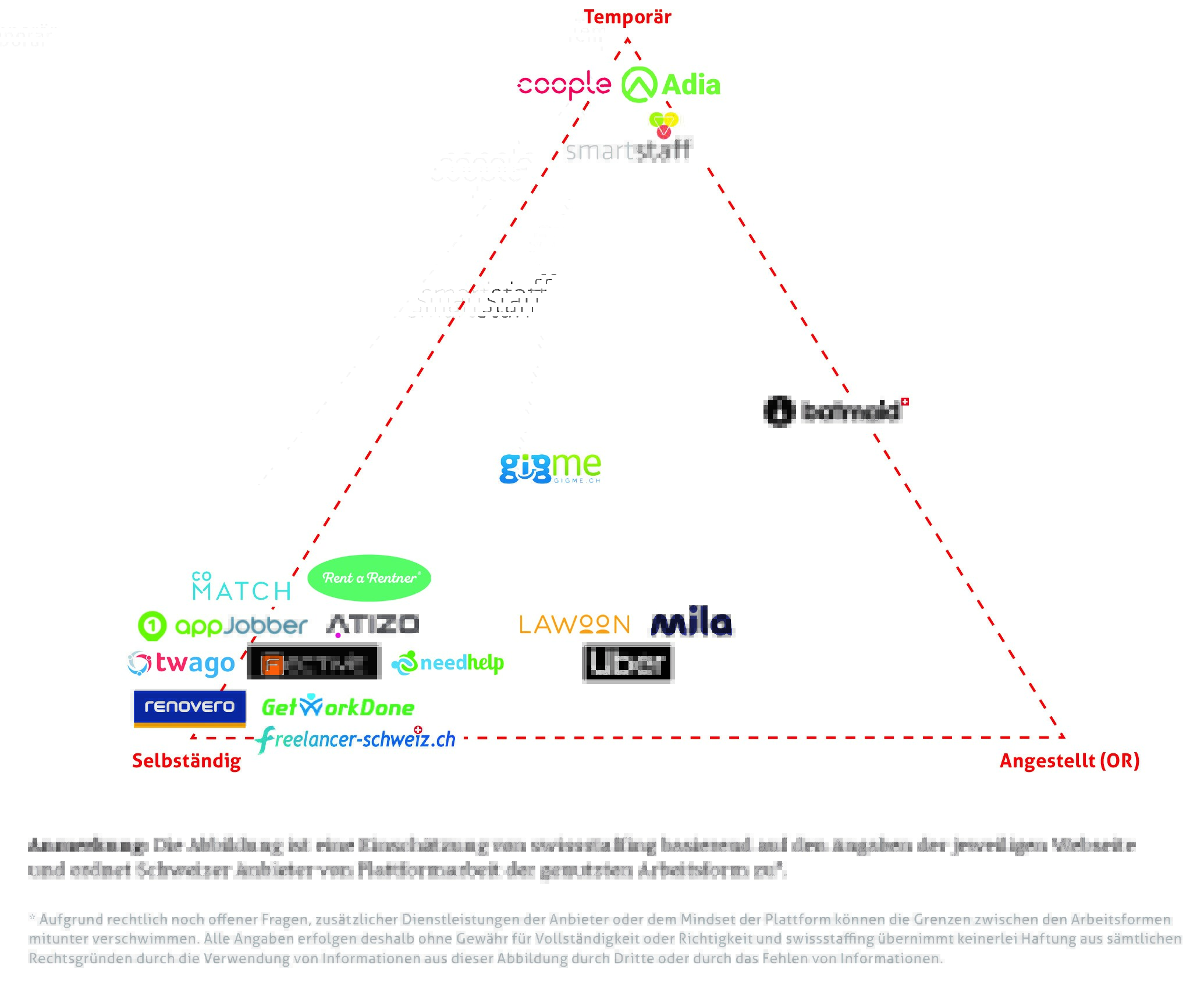 Die Arbeitsform Temporärarbeit entspricht nicht nur dem Zeitgeist sondern könnte auch die Lösung für die Absicherung der aufkommenden Plattformarbeit sein. Uber, der Inbegriff der Plattformarbeit, sieht sich in zahlreichen Ländern dem Vorwurf ausgesetzt, die Plattform müsse eigentlich als Arbeitgeber und nicht als reine Vermittlungsplattform auftreten. Eine Analyse der Plattform-Landschaft in der Schweiz zeigt: Die meisten Plattformen verstehen sich hierzulande als reine Vermittler. Daher dürfte die Mehrheit der vermittelten Erwerbstätigen als Selbstständige oder im Nebenverdienst tätig sein. Dass es auch anders geht, beweisen die Plattformen ADIA, Coople und Smartstaff. Bei ihnen sind die Plattformarbeitenden als Temporärarbeitende angestellt und entsprechend sozialversichert – eine Lösung mit Zukunftspotenzial für Unternehmen, Temporärarbeitende und die sozialen Sicherungssysteme.