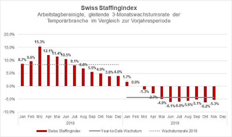 Gemäss dem Swiss Staffingindex sind in den letzten drei Monaten die Einsatzstunden um 5,3 Prozent im Vergleich zum Vorjahr zurückgegangen. Seit Jahresbeginn liegt die Abnahme im Vergleich zum Vorjahr bei 4,4 Prozent. Damit bleibt das Marktumfeld in der Temporärbranche schwierig. Jedoch zeichnet sich derzeit keine weitergehende Eintrübung ab.