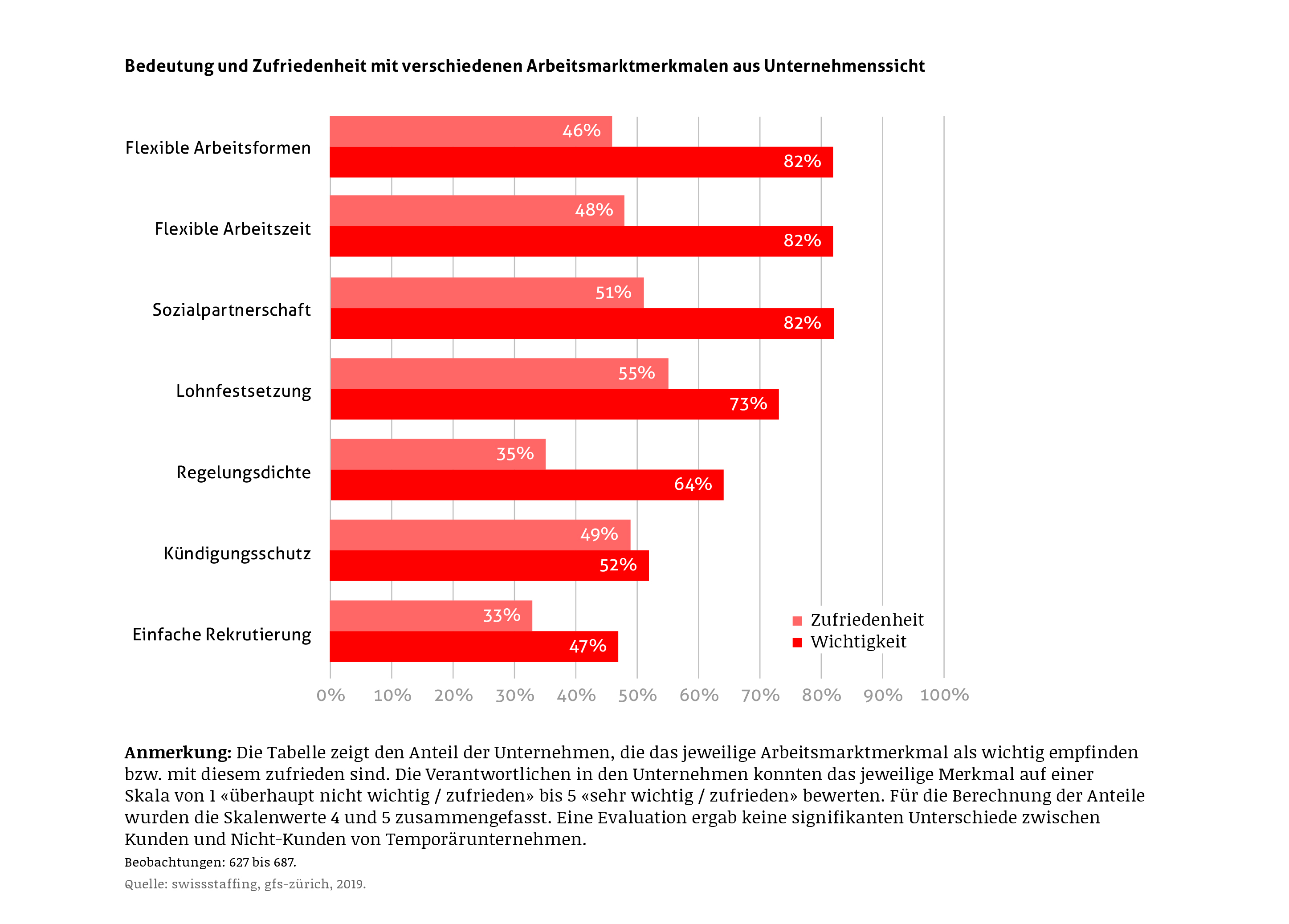 In der Wahrnehmung der Personalverantwortlichen ist der Schweizer Arbeitsmarkt weit weniger liberal, als die internationale Optik vermuten lässt. Dies zeigt eine im Auftrag von swissstaffing durchgeführte Befragung von knapp 700 Personalern durch das Meinungs- und Sozialforschungsinstituts gfs-zürich. Zwar zählen flexible Arbeitsformen, flexible Arbeitszeiten und die Sozialpartnerschaft für 82 Prozent der Antwortenden zu den wichtigsten Merkmalen eines liberalen Arbeitsmarkts, doch sind nur etwa die Hälfte der Befragten zufrieden oder sehr zufrieden, wie diese in der Praxis umgesetzt werden. Warum Flexibilität einen so hohen Stellenwert in der Wirtschaft geniesst, zeigt ein Blick auf den Beschäftigungsmix. So wird nach Angaben der Personalverantwortlichen im Durchschnitt ein Viertel der anfallenden Tätigkeiten nicht von Festangestellten, sondern von Freelancern, Temporärarbeitenden und Arbeitnehmenden mit befristetem Arbeitsvertrag erledigt. Diese Flexworker helfen Unternehmen, auf Auftragsschwankungen rasch zu reagieren, Überstunden zu minimieren oder Experten beizuziehen. Flexibilität wird aber auch durch flexible, interne Arbeitszeitregelungen erreicht. Beispielsweise nutzen 74 Prozent der Unternehmen Arbeitszeitkonten.