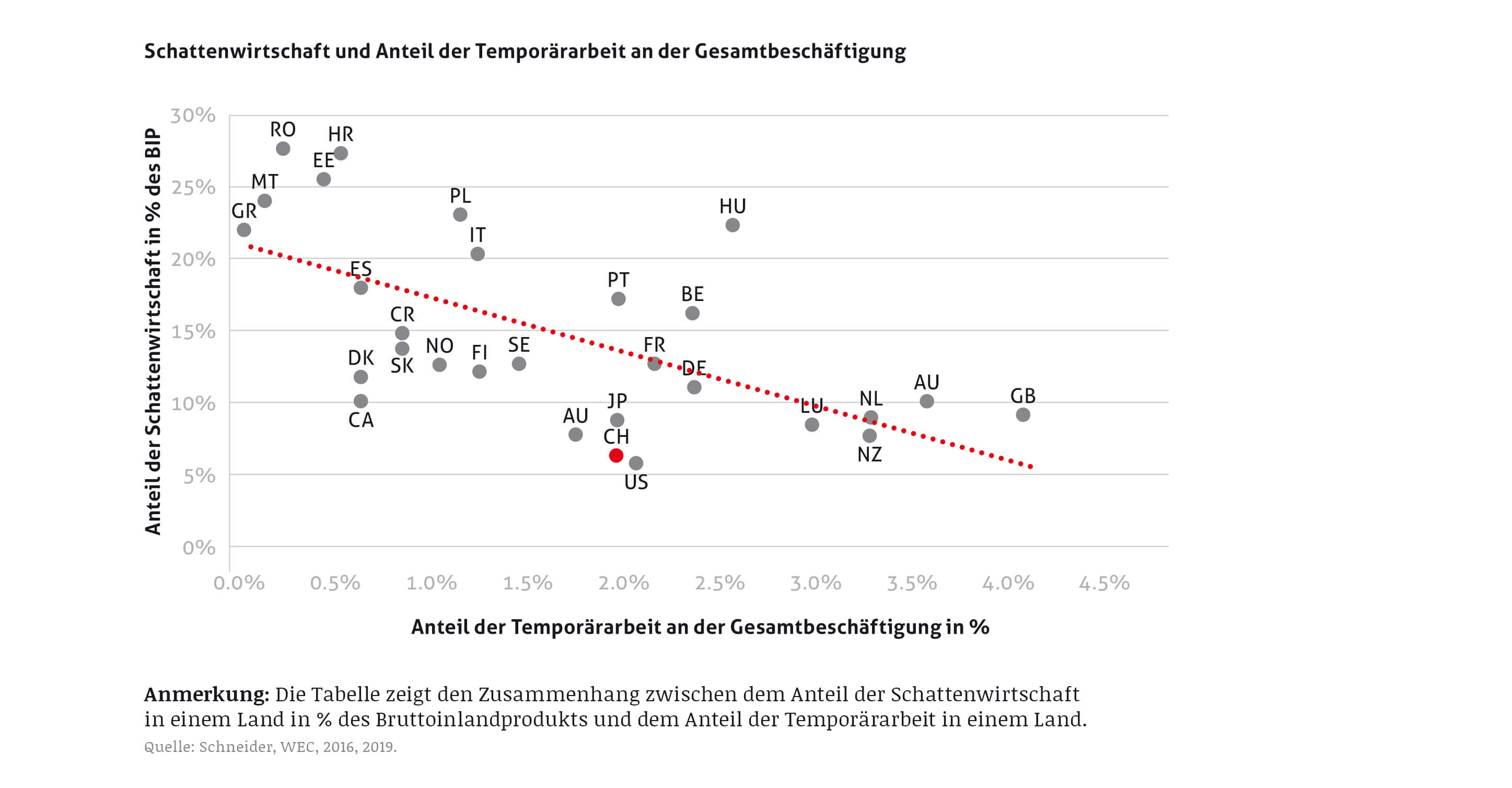 Aus internationaler Optik bilden der liberale Arbeitsmarkt und das ausgebaute Sozialsystem Errungenschaften, die die Vorteile des amerikanischen und europäischen Wirtschaftssystems kombinieren. In jüngerer Zeit gerät der liberale Arbeitsmarkt in Politik und Medien jedoch zunehmend unter Druck. Tiefere Erwerbslosenquoten in Deutschland und den USA nagen am Vertrauen in das hiesige System. Diese Verunsicherung nutzen zahlreiche Akteure, um Forderungen wie kantonale Mindestlöhne, eine Ausdehnung des Kündigungsschutzes, oder eine Beschränkung der Temporärarbeit durchzusetzen – Forderungen, die bis vor kurzem chancenlos gewesen wären. Die Umsetzung solcher Massnahmen birgt mehr Risiken als Chancen. Mit einer Arbeitsmarktpartizipation von 84,2 Prozent liegt die Schweiz unter den OECD-Ländern auf Platz 2 und schöpft das Inländerpotenzial besser als kaum ein anderes Land aus. Die Gefahr ist hoch, mit gut gemeinter Regulierung die Leistungsfähigkeit des Arbeitsmarktes zu mindern und das Prinzip eines liberalen Arbeitsmarktes Schritt für Schritt aufzugeben.