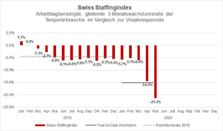 Gemäss Swiss Staffingindex ist die Geschäftstätigkeit der Temporärbranche in den Monaten März, April und Mai 2020 im Vergleich zum Vorjahreszeitraum um 21,3 Prozent zurückgegangen. In den beiden voll von der Corona-Krise betroffenen Monaten April und Mai lag das Minus bei 27 Prozent bzw. 24 Prozent. Damit haben sich die Lockerungsmassnahmen im Monat Mai noch kaum in einer anziehenden Geschäftsentwicklung bemerkbar gemacht.