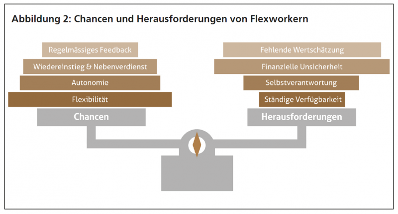 Die Gründe für die Wahl einer flexiblen Arbeitsform sind vielfältig. Viele Flexworker entscheiden sich bewusst für diese Arbeitsform. Ihre zentralen Motive sind die hohe Flexibilität, die eine Vereinbarkeit der Arbeit mit privaten Verpflichtungen (Kinder- oder Elternbetreuung, Studium) ermöglicht sowie finanzielle Gründe. Um finanzielle Lücken zu schliessen, können Selbstständigerwerbende neben ihrer Haupttätigkeit beispielsweise zusätzliche Aufträge über eine Online-Arbeitsplattform annehmen. Andere Flexworker nutzen diese Arbeitsform für den Einstieg oder Wiedereinstieg ins Berufsleben oder in bestimmte Tätigkeitsfelder.