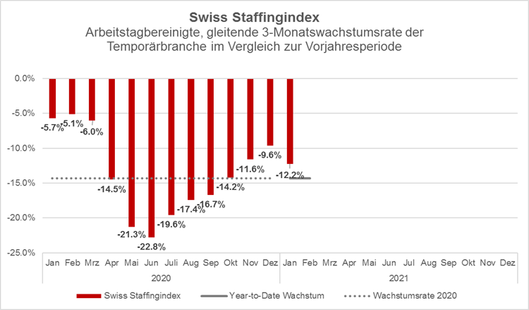 Der Swiss Staffingindex zeigt von November bis Januar einen Rückgang der geleisteten Arbeitsstunden um 12,2 Prozent im Vergleich zum Vorjahreszeitraum. Damit macht sich der zweite Lockdown bereits in den Geschäftszahlen der Temporärbranche bemerkbar. Im 4. Quartal 2020 fiel das Minus mit 9,6 Prozent geringer aus. Allerdings: Im Vergleich zum ersten Lockdown fällt der Rückgang moderat aus – was zeigt, dass sich Branche wie Wirtschaft wo möglich an die neue Situation angepasst haben.