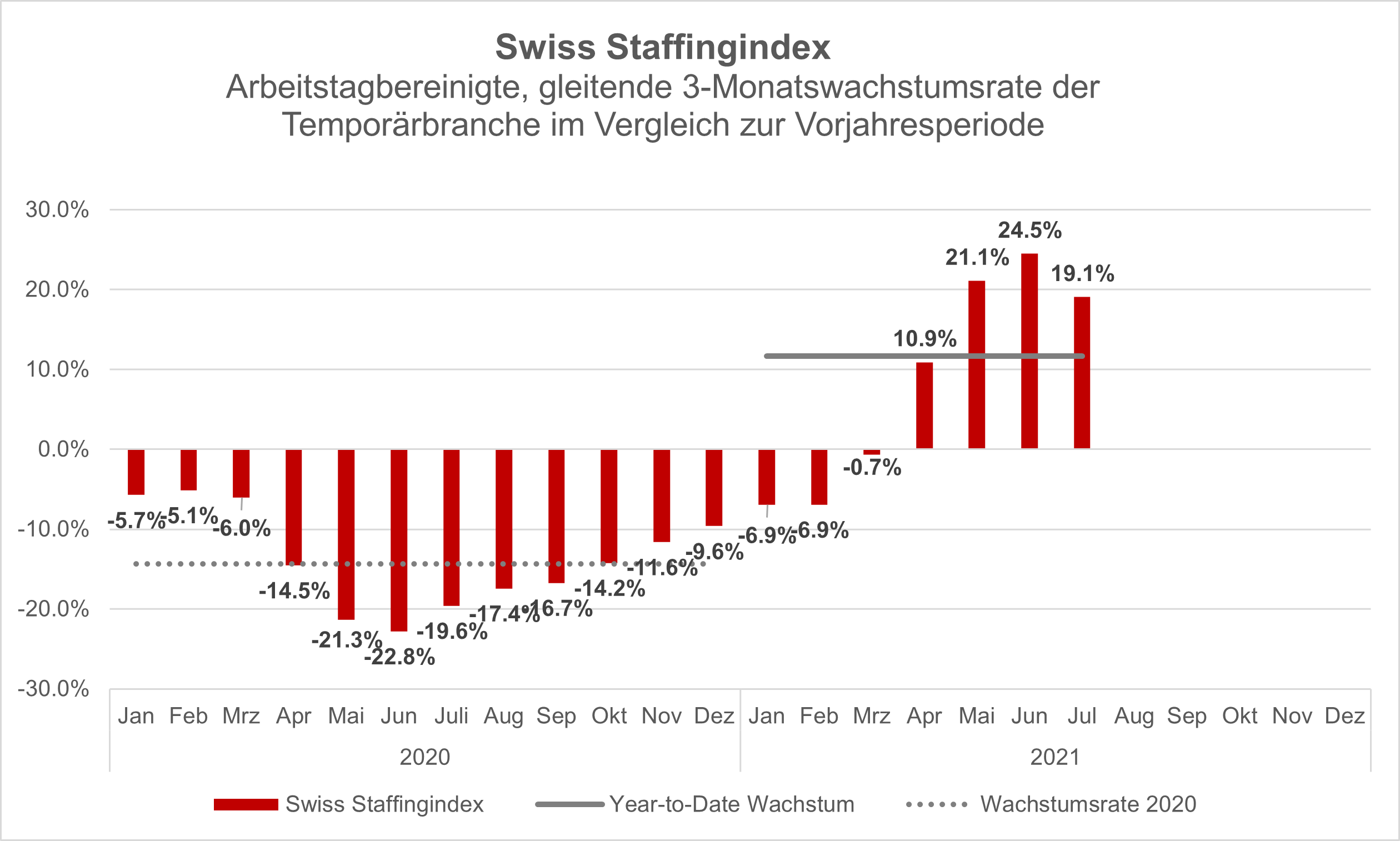 Der Aufwärtstrend in der Temporärbranche setzt sich fort. Der Swiss Staffingindex stieg im Juli um 19,1 Prozent gegenüber der Vorjahresperiode. Auf den ersten Blick scheint das markante Wachstum des 2. Quartals gebremst. Dieses resultierte allerdings durch den Vergleich mit den Vorjahresmonaten im Lockdown, als der Index Tiefstwerte verzeichnete. Der aktuelle Swiss Staffingindex bezieht sich auf Vorjahresmonate nach der Öffnung, als sich bereits wieder eine leichte Erholung zeigte.