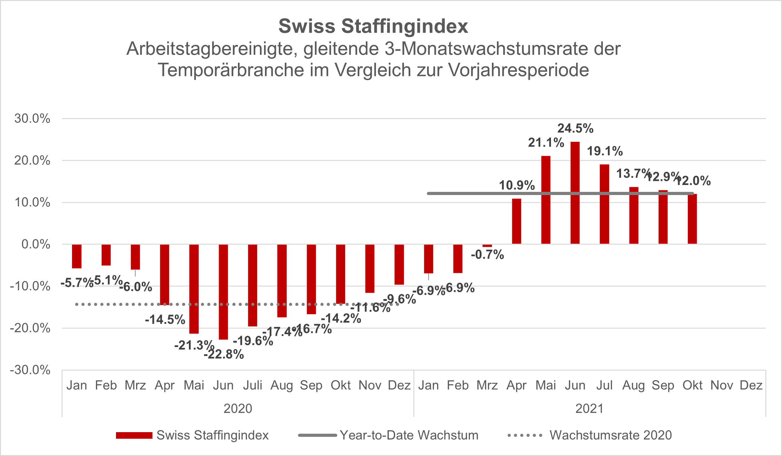 Die Temporärbranche macht weiter Boden gut und holt Verluste aus dem Corona-Jahr auf. Der Swiss Staffingindex steigt in den Monaten August, September und Oktober 2021 um 12 Prozent gegenüber dem Vorjahreszeitraum. Seit Jahresbeginn liegen die Zugewinne bei 12,1 Prozent. In Anbetracht des Einbruchs von 14,3 Prozent im Corona-Jahr ist im Jahr 2022 eine erneute Aufholjagd erforderlich, um an die alten Höchststände bei der Geschäftstätigkeit anknüpfen zu können.