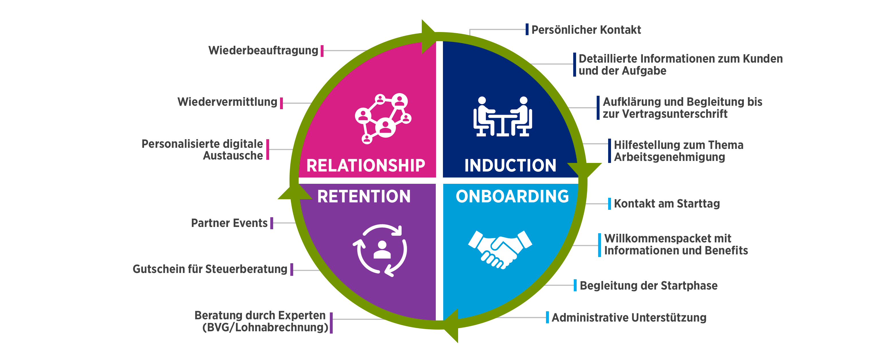 - Die Kandidaten/Kandidatinnen & Dienstleister profitieren von eingespielten Prozessen und sie erleben einen erstklassigen „Candidate Life Cycle"