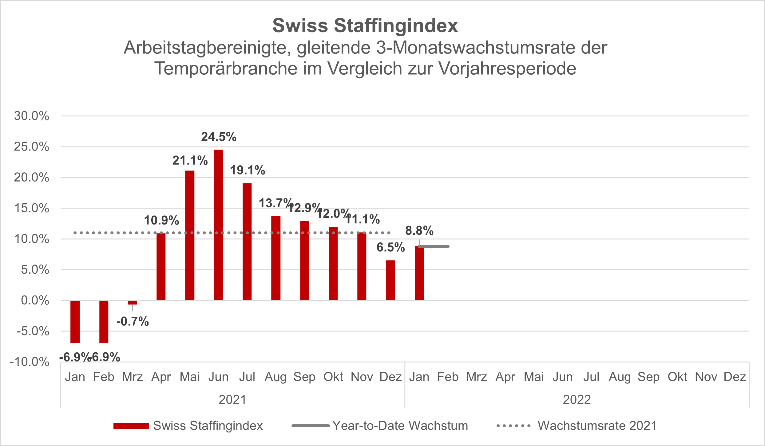 Die Temporärbranche startet erfreulich in das Jahr 2022. Der Swiss Staffingindex legt in den Monaten November, Dezember 2021 und Januar 2022 um 8,8 Prozent gegenüber dem Vorjahreszeitraum zu. Allein das Plus im Januar liegt bei 8,5 Prozent gegenüber dem Vorjahr. Damit befindet sich die Branche weiter auf dem Wachstumspfad, um an alte Höchststände anzuknüpfen.