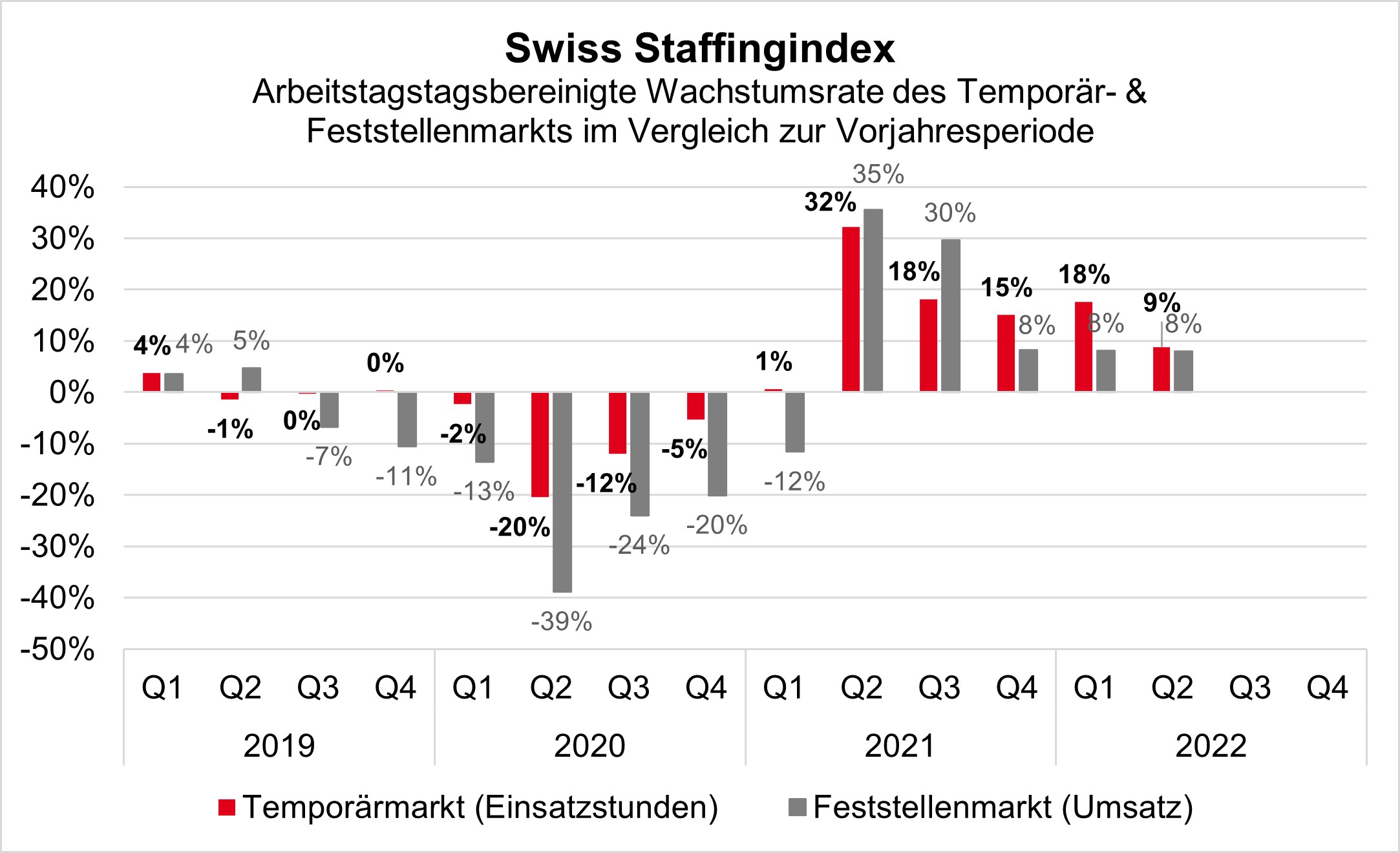 Paradoxerweise machen Arbeitskräftemangel und eine langsamere Weltwirtschaft besonders in der Region Basel den Personaldienstleistern das Leben schwer. Die Nachfrage nach chemisch-pharmazeutischen Produkten ging im 2. Quartal um 400 Millionen Franken zurück, wie das Bundesamt für Zoll und Grenzsicherheit (BAZG) am 19. Juli 2022 bekannt gab. Obwohl dieser Rückgang nur 1,2 Prozent der Gesamtexporte der Chemie- & Pharmabranche entspricht, kann dies einen Teil des Nachfragerückgangs von Temporärkräften im Raum Basel erklären, da Temporärarbeitende Leistungsspitzen abdecken. Dieser Zusammenhang dürfte auch schweizweit das Branchenwachstum belasten. Gemäss dem KOF Konjunkturbarometer schwächelt derzeit die Auslandsnachfrage insgesamt. Dies ist jedoch nur die halbe Wahrheit.
