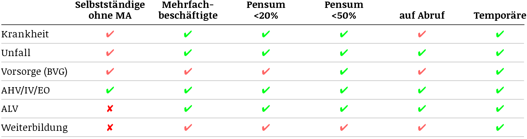 Für Selbstständigerwerbende sind bestimmte Versicherungen nicht obligatorisch (Vorsorge/BVG), nicht abschliessbar (Arbeitslosenversicherung) oder kaum zu finanzieren (Krankentaggeldversicherung). Für Mehrfachbeschäftigte besteht aufgrund der BVG-Eintrittsschwelle von 21'510 Franken und des Koordinationsabzugs die Gefahr grosser Lücken in der beruflichen Vorsorge (Pensionskasse). Diese sichert im Alter den Lebensstandard sowie Risiken wie Tod und Invalidität ab. Etwas, womit auch Personen in tiefen Arbeitspensen und Arbeitende auf Abruf konfrontiert sind. Letztere sind zudem oftmals nicht gegen Krankheit versichert.