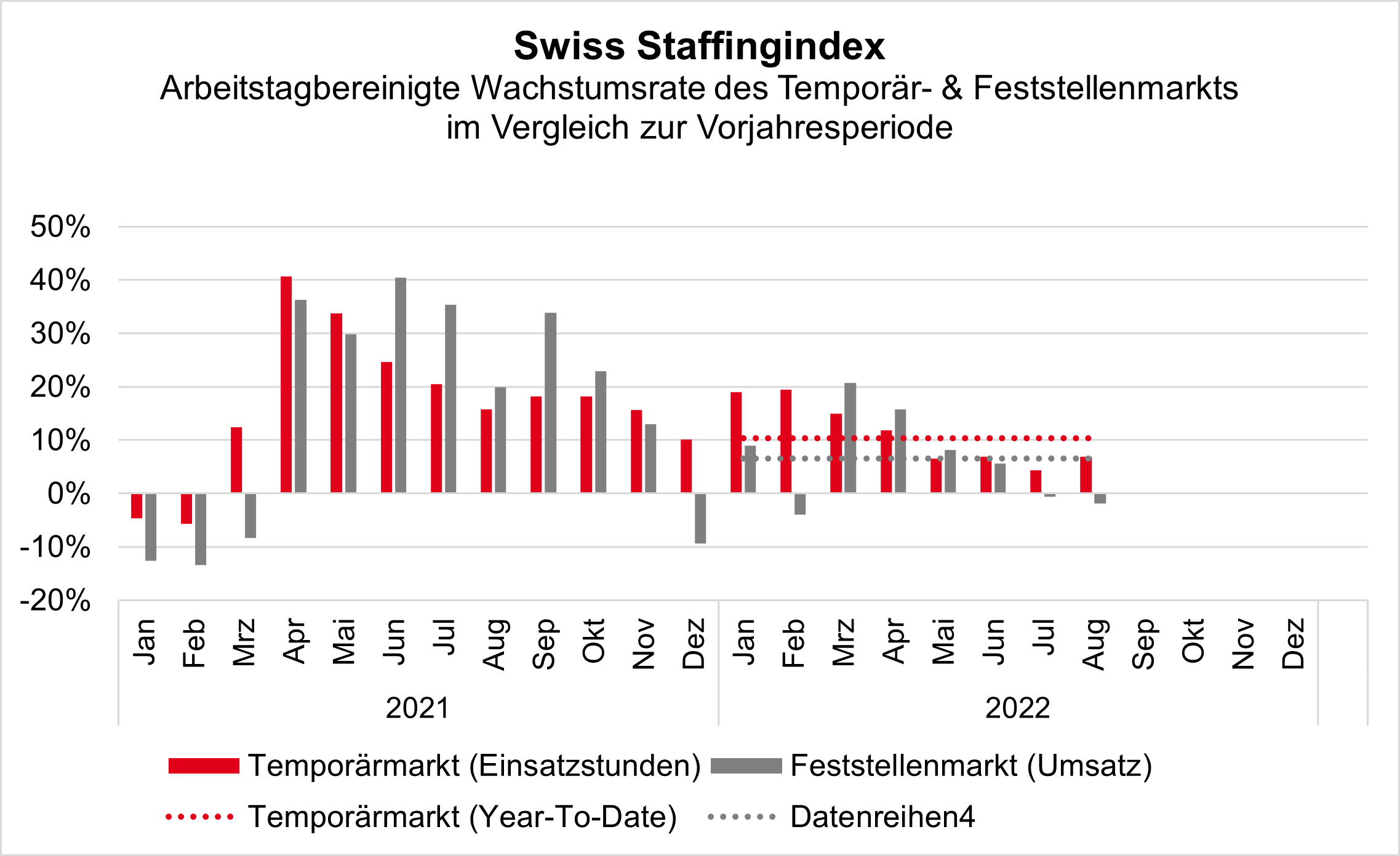 Die Geschäftsentwicklung der Personaldienstleister bleibt im August uneinheitlich. Während die Einsatzstunden bei den Temporärarbeitenden um rund 7 Prozent im Vergleich zum Vorjahr zunahmen, setzt sich im Bereich der Feststellenvermittlungen der Abwärtstrend fort. Der Feststellenumsatz sank im August um knapp 2 Prozent gegenüber Vorjahr. Damit geht die Talfahrt seit März weiter.