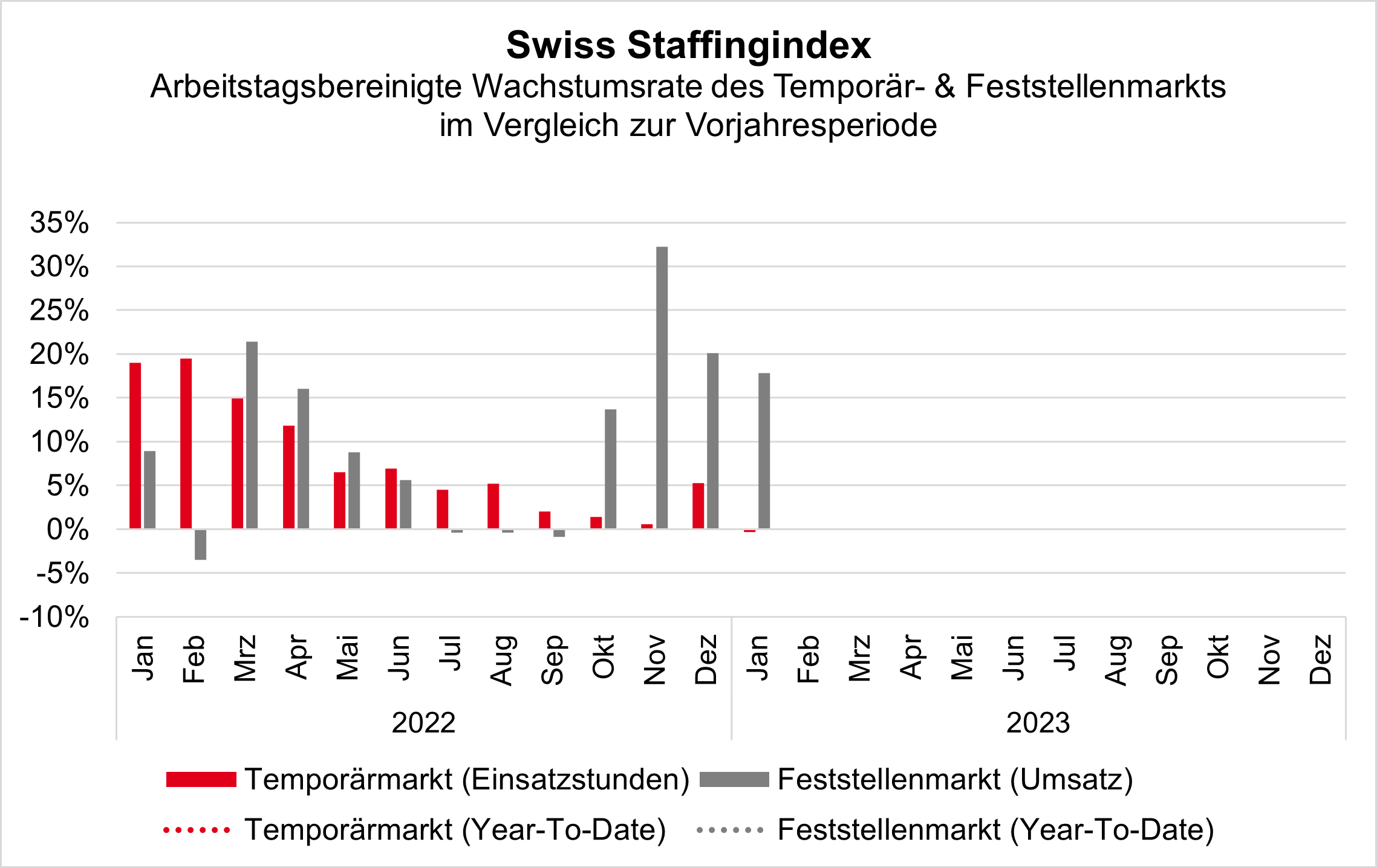 Die Personaldienstleister dürfen trotz roter Null im Temporärmarkt stolz auf den Jahresstart sein. Der Swiss Staffingindex zeigt: Mit einem leichten Rückgang von 0,3 Prozent konnten die Temporärunternehmen die Werte des sensationellen Vorjahresmonats knapp halten. Der Feststellenmarkt brummte hingegen weiter. Um 17,8 Prozent nahm der Umsatz in diesem Geschäftsfeld im Vergleich zum Vorjahr zu. Damit bewegen sich die Personaldienstleister souverän in einem von Arbeitskräftemangel und Konjunkturunsicherheiten geprägten Markt.