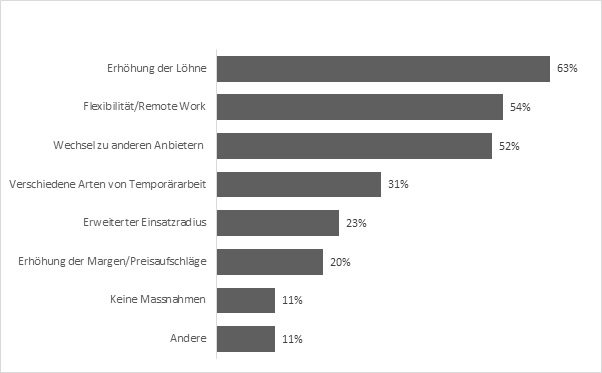 Zu den Massnahmen, die weniger als 50 % ergriffen, gehörten eine Neuausrichtung hinsichtlich der Art der Temporärarbeit (31 %), eine Ausweitung des Einsatzradius und eine Erhöhung der Margen/Preisaufschläge. Nur 11 % der Unternehmen gaben an, dass sie 2022 keine Massnahmen zur Bekämpfung des Fachkräftemangels ergriffen haben, was bestätigt, dass Talentknappheit weit verbreitet ist.