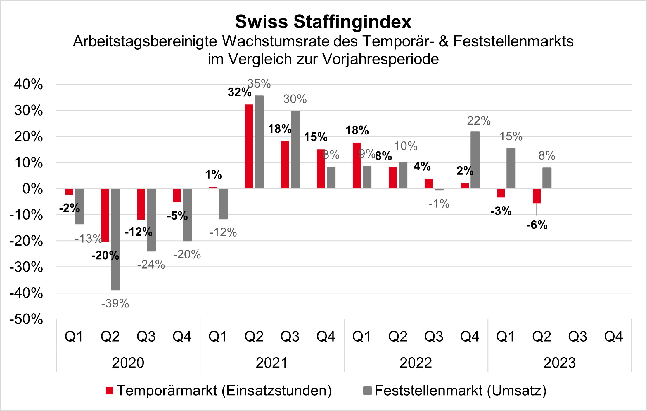 Die Personaldienstleister schliessen im Temporärgeschäft das zweite Quartal 2023 mit einem Minus von 5,6 Prozent gegenüber dem Vorjahr ab. Im Bereich Feststellen legte der Umsatz hingegen um 7,9 Prozent zu. Temporärstellen im Minus, Feststellen im Plus sind typische Zeichen für Vollbeschäftigung: Während Temporärkräfte von ihren Einsatzbetrieben schneller festangestellt werden, nimmt die Rekrutierung von neuen Temporärarbeitenden ab. Im Feststellenmarkt übernehmen Personaldienstleister immer mehr Beratungs- und Headhunterfunktionen. Das sorgt für Wachstum und führt fast zum Erreichen des Rekordniveaus aus dem Jahr 2019.