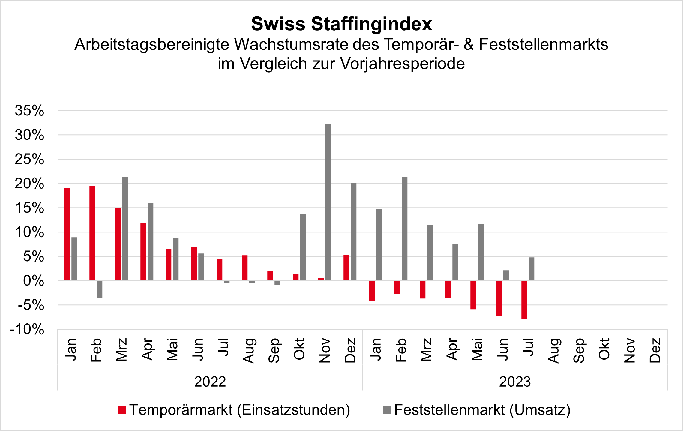 Der Swiss Staffingindex zeigt: Auch im Juli driften Temporär- und Feststellenmarkt auseinander. Die geleisteten Einsatzstunden im Personalverleih nahmen um 7,9 Prozent gegenüber dem Vorjahres-monat ab. Der Umsatz bei den Feststellenvermittlungen legte hingegen um 4,8 Prozent zu. Damit bleibt das typische Marktbild für eine Hochkonjunkturphase bestehen. Ein ausgetrockneter Arbeitsmarkt macht kurzfristige Temporärstellenantritte schwierig. Im Feststellengeschäft bleibt durch grösseres Rekrutierungspotenzial und längere Vorlaufzeiten Luft für eine positive Geschäftsentwicklung.