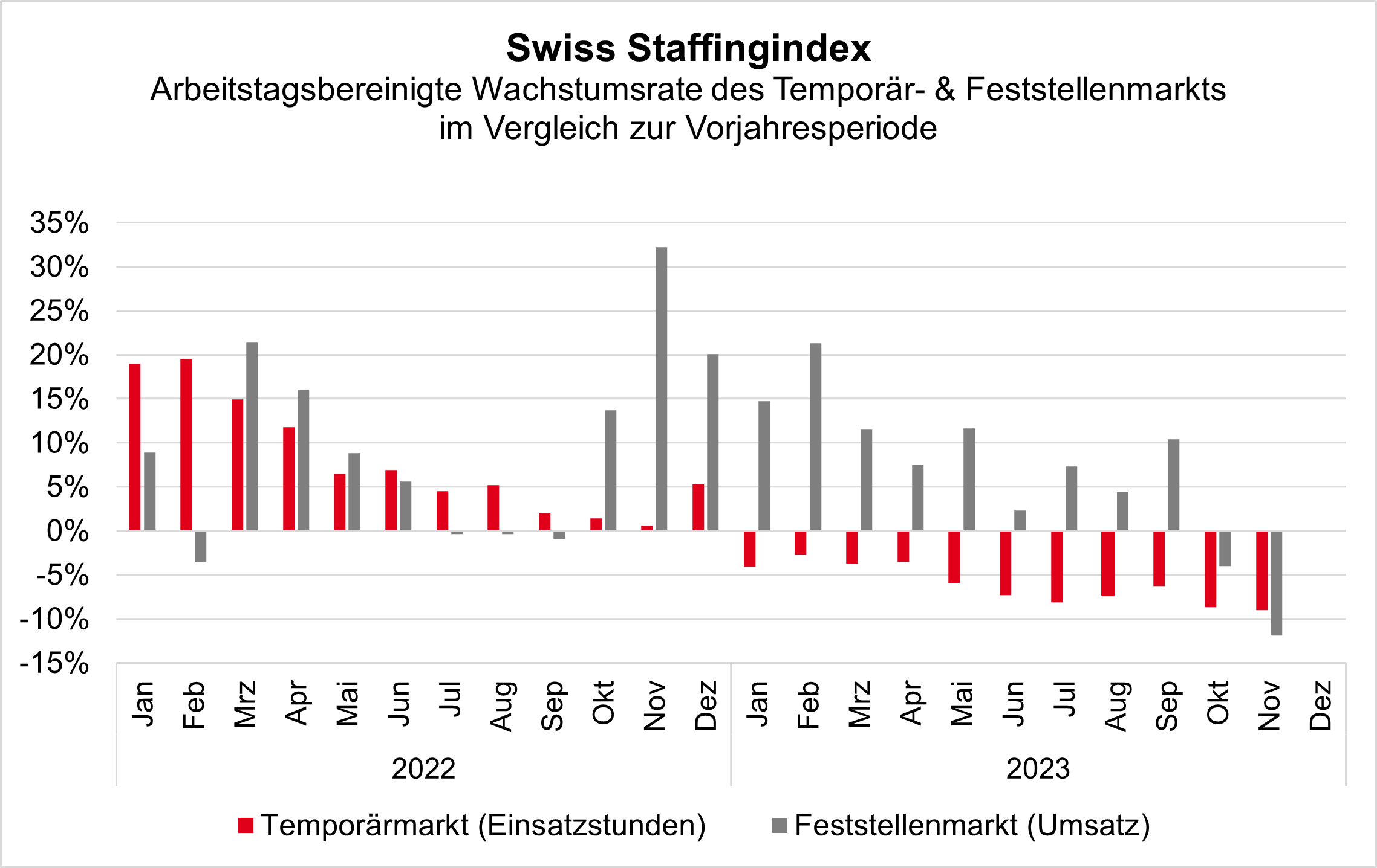 Im November verharren der Temporär- und der Feststellenmarkt im Minus. Die geleisteten Einsatzstunden im Personalverleih nahmen gegenüber dem Vorjahresmonat um 9 Prozent ab. Der Umsatz bei den Feststellenvermittlungen sank sogar um knapp 12 Prozent. Damit bestätigt sich die Marktlage, die sich bereits im Oktober abzeichnete: Die sich verlangsamende Wirtschaft erreicht den Arbeitsmarkt und sorgt in beiden Geschäftsbereichen der Personaldienstleister für rote Zahlen.