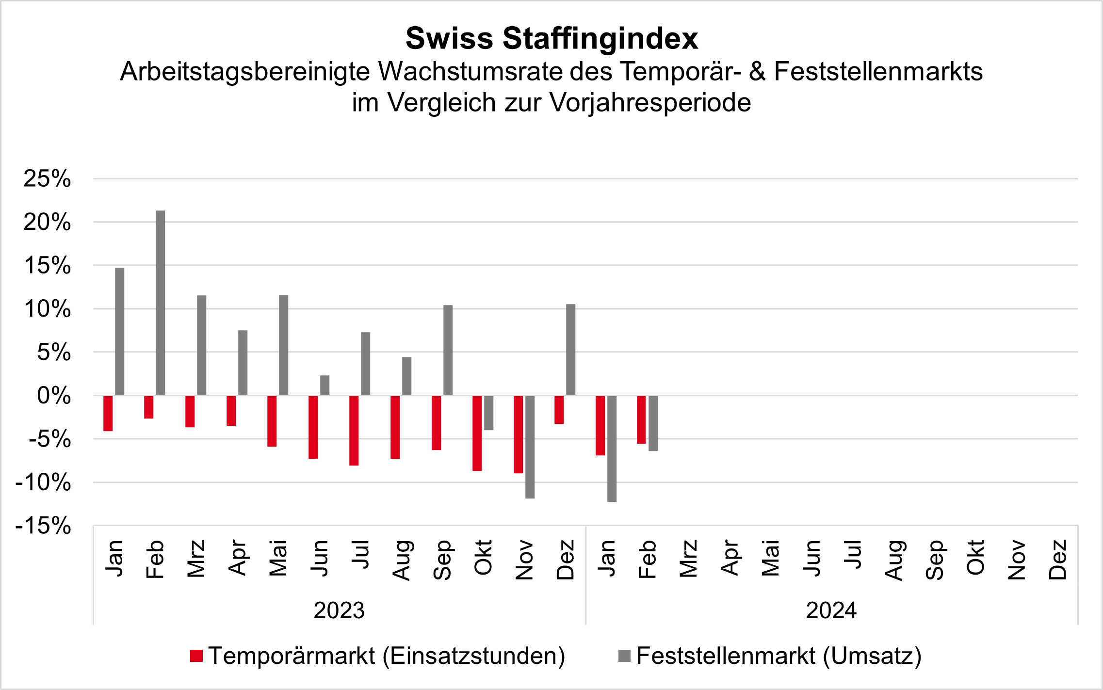 Die Talfahrt des Temporär- und Festellenmarkts setzt sich im Februar fort. Die geleisteten Einsatzstunden im Personalverleih nahmen gegenüber dem Vorjahresmonat um 5,6 Prozent ab. Der Umsatz bei den Feststellenvermittlungen sank um 6,4 Prozent. Die konjunkturelle Abkühlung macht dem Temporärmarkt damit weiter zu schaffen: Während sich die Verfügbarkeit von Kandidaten verbessert, wird es nun schwieriger bei Einsatzbetrieben offene Positionen zu finden.