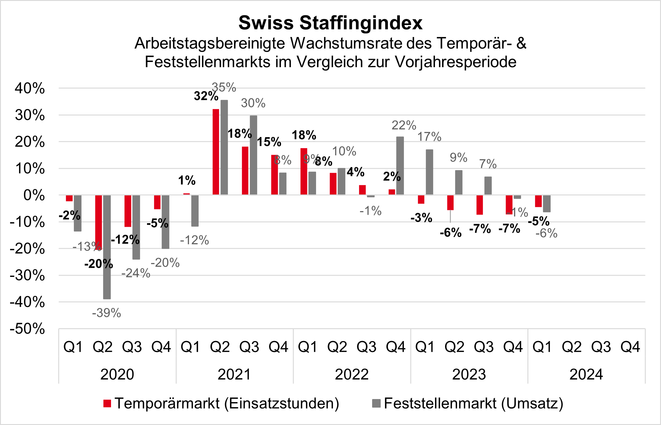 Die abflauende Konjunktur lässt die Personaldienstleister mit roten Zahlen in das neue Jahr starten. Um 4,5 Prozent ging das Temporärgeschäft im ersten Quartal 2024 gegenüber dem Vorjahr zurück. Das Minus im Feststellenmarkt war mit 6,3 Prozent noch deutlicher. Der Rückgang in beiden Geschäftsbereichen ist ein klares Zeichen für eine schwächelnde Konjunktur. Der Bedarf an Arbeitskräften sinkt bei den Unternehmen. Mit abnehmender Auftragslage benötigen sie weniger kurzfristiges Personal und zögern die Besetzung von Dauerstellen heraus. Nach wie vor gute Chancen haben Fachkräfte in Mangelberufen, etwa in der Informatik, in der Industrie und im Gesundheitswesen. Demographischer und technologischer Wandel lassen die Nachfrage in diesen Branchen wachsen und verändern die Profile in ungeahnter Geschwindigkeit.