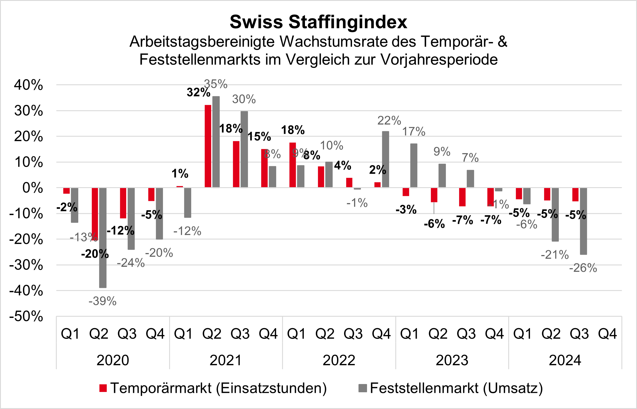 Die anhaltende Konjunkturschwäche setzt den Schweizer Arbeitsmarkt spürbar unter Druck. Besonders im Feststellengeschäft zeigen sich markante Einbrüche im Vergleich zum Vorjahr: Mit einem Umsatzrückgang von 25,9 Prozent ist das Minus im 3. Quartal nochmals grösser als im Vorquartal mit 20,8 Prozent. Auch der Temporärsektor verzeichnet einen weiteren Rückgang der Einsatzstunden um 5,3 Prozent. Diese Entwicklungen deuten auf eine zunehmende Verunsicherung der Unternehmen hin, die sich angesichts unsicherer Zukunftsaussichten mit der Schaffung neuer Stellen zurückhalten. Die strukturelle Unsicherheit verstärkt den wirtschaftlichen Abschwung und belastet die gesamte Branche.