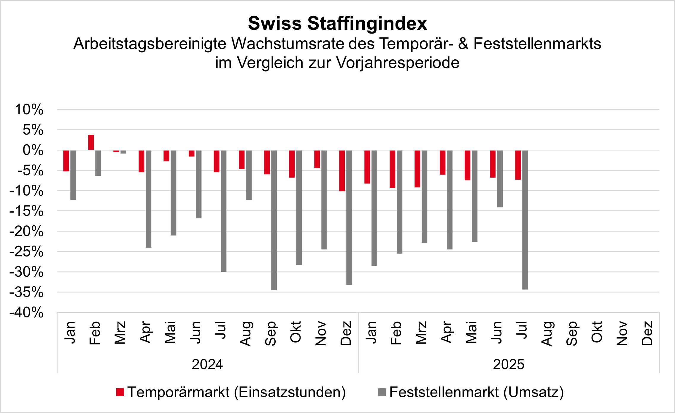 Im Juli verzeichneten sowohl der Temporär- als auch der Feststellenmarkt weitere Rückgänge. Die Arbeitsstunden im Temporärgeschäft gingen um 7,3 Prozent im Vergleich zum Vorjahresmonat zurück. Der Umsatz mit Feststellenvermittlungen brach um 33,4 Prozent ein. Dies zeigt: Bereits vor dem US-Zollschock sahen sich die Personaldienstleister einem schrumpfenden Markt gegenüber. Da die Temporärbranche im Industriesektor stark vertreten ist, dürfte die Entwicklung auch in den kommenden Monaten negativ bleiben.
