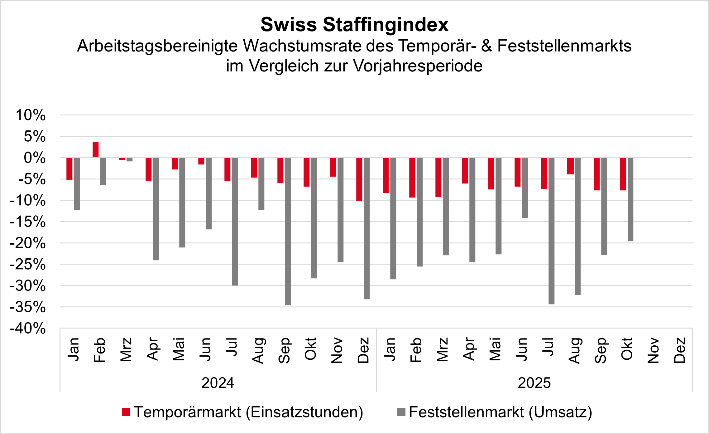 Die Eintrübung des Geschäfts deckt sich mit den jüngsten Schnellschätzungen des SECO für das BIP-Wachstum im dritten Quartal. Die Schweizer Wirtschaft schrumpfte um 0,5%. Ursache für den Rückgang war ein schwächelnder Industriesektor – angeführt von einem schwachen Geschäft der chemisch-pharmazeutischen Industrie. Auch der Dienstleistungssektor entwickelte sich nur unterdurchschnittlich. Gerade der Rückgang in der Industrie dürfte das Geschäft der Personaldienstleister besonders belasten.