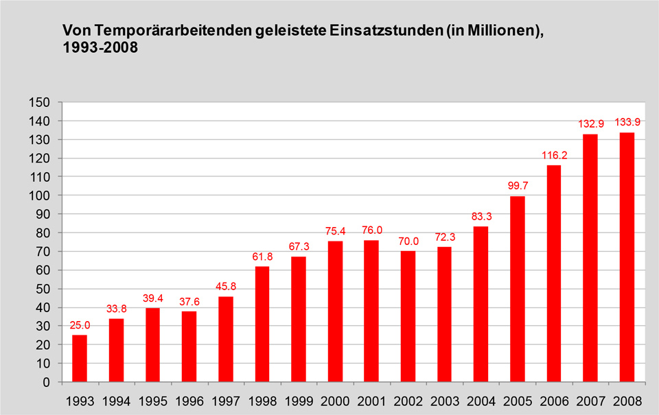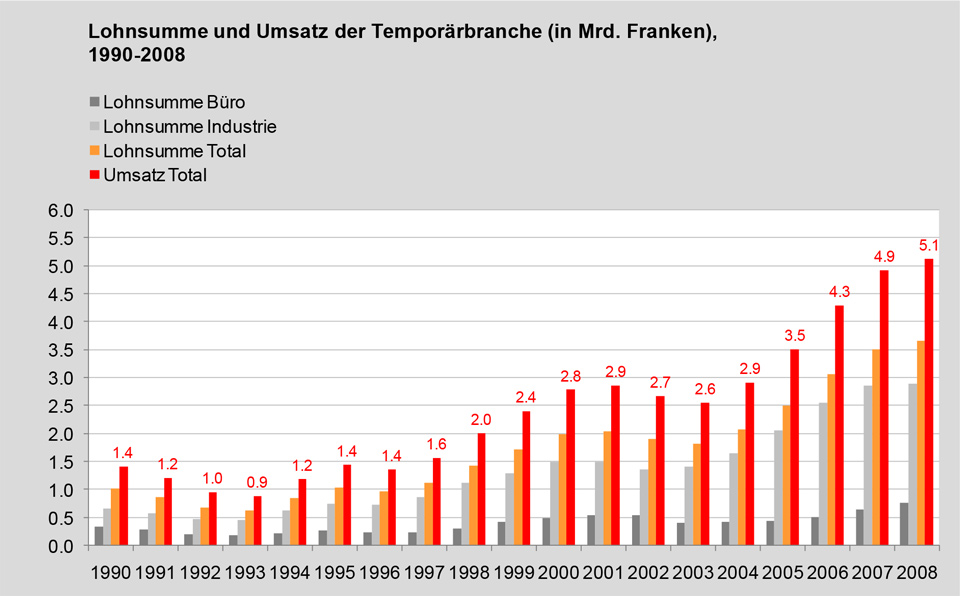 Das Einsatzstunden-Volumen ist im 2008 gegenüber 2007 zwar lediglich um 0,7% auf 134 Millionen angestiegen. Bezogen auf die Lohnsumme und den Umsatz der Temporärbranche konnte hingegen ein Zuwachs von 4,2% verzeichnet werden. Hinsichtlich der Anzahl temporär Arbeitender resultierte gar ein Wachstum von 7,5%. Im Jahr 2008 waren 282'000 temporär Arbeitende im Einsatz, die insgesamt eine Lohnsumme von 3,7 Milliarden Franken erwirtschafteten. 6,3% der Erwerbstätigen in der Schweiz arbeiteten im 2008 somit zumindest zeitweise temporär. Der (hochgerechnete) Umsatz der Temporärbranche belief sich im 2008 auf 5,1 Milliarden Franken.