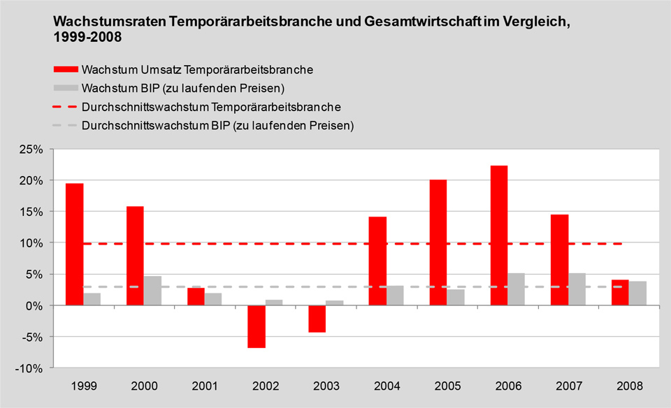 Es handelt sich bei der Temporärbranche um eine äusserst dynamische Branche. Sie wuchs im letzten Jahrzehnt (1999-2008) jedes Jahr um durchschnittlich 9,8%. Demgegenüber verzeichnete das BIP in derselben Periode ein durchschnittliches Jahreswachstum von 3,0% (nominal).