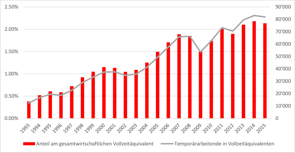 Legende: 2015 leisteten die Temporärarbeitenden 165 Mio. Einsatzstunden. Umgerechnet entspricht dies 81'939 Vollzeitstellen. Somit arbeiten rund 2,1% der Erwerbstätigen in einem temporären Arbeitsverhältnis.