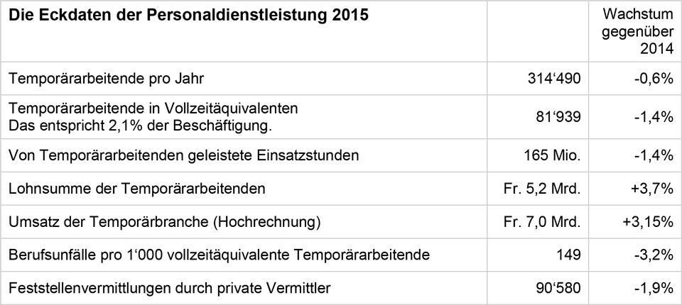 „Die Temporärbranche hat im Jahr 2015 trotz schwierigem, gesamtwirtschaftlichem Umfeld beachtlich abgeschnitten", so Myra Fischer-Rosinger, Direktorin von swissstaffing, dem Branchenverband der Personaldienstleister. Die Temporärfirmen vermittelten im 2015 über 314'000 Menschen einen Temporäreinsatz. Insgesamt leisteten Temporärarbeitende 165 Millionen Einsatzstunden, und die Branche generierte einen Umsatz von 7 Milliarden Franken.