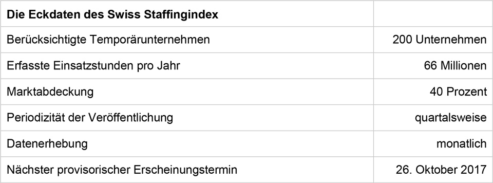 Der Swiss Staffingindex vereint die Einsatzstunden von rund 200 Schweizer Personalverleihern in einem Indikator für den Temporärmarkt. Zu den Firmen gehören Branchengrössen wie die Adecco Human Ressources AG, Manpower AG, Randstad Schweiz AG, Kelly Services Schweiz AG, Interiman Group Holding SA, dasteam ag oder Bellini Personal AG. Mit 66 Millionen gearbeiteten Einsatzstunden deckt der Index 40 Prozent des Schweizer Temporärmarktes ab und ist repräsentativ für die Branchenentwicklung.