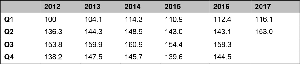 Die Index-Entwicklung des Swiss Staffingindex in der Übersicht, Basis: Q1 2012