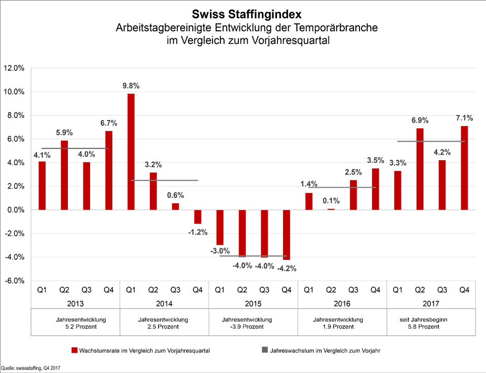 Hinter den guten Zahlen verbergen sich auch Risiken: Steigende Leerstände bei den Mietwohnungen sowie die sinkende Zuwanderung könnten zu einer Überhitzung des Bausektors führen – eine Schlüsselindustrie für die Temporärunternehmen. Zudem drohen Einschränkungsbemühungen bei der Temporärarbeit, die wichtige Einstiegsjobs als erstes zerstören. Die gute Entwicklung der Weltwirtschaft und das anziehende Wachstum in der Schweiz lassen die Temporärbranche aber auf ein gutes Jahr 2018 hoffen. Marius Osterfeld, Ökonom bei swissstaffing schätzt: „Bestätigt sich der historische Zusammenhang zwischen BIP-Wachstum und Swiss Staffingindex, könnte die Branche 2018 erneut bis zu 5,8 Prozent wachsen."