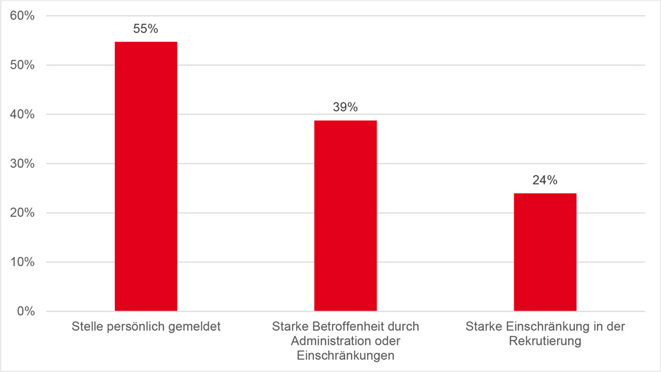 Ein halbes Jahr nach der Einführung der Stellenmeldepflicht sieht sich jedes vierte Unternehmen in der Rekrutierung eingeschränkt. Dies zeigt eine Befragung unter 650 Geschäftsführenden und Personalverantwortlichen, die das Markt- und Sozialforschungsinstitut gfs-zürich für swissstaffing und den Schweizerischen Gewerbeverband durchgeführt hat. Der Anteil der Unternehmen, die sich durch Einschränkungen und administrative Mehrbelastung stark betroffen fühlen, liegt mit 39 Prozent noch höher. Der Grund: Bei jeder offenen Vakanz muss die Pflicht zur Meldung geprüft und allenfalls eine Meldung vorgenommen werden.