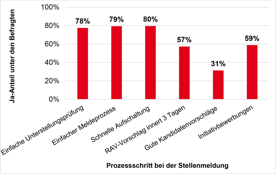 Der Fokus von Bund und Kantonen auf ein wirtschaftsfreundliches Meldeverfahren hat sich bezahlt gemacht. 80 Prozent der befragten Unternehmen finden die Prüfung der Unterstellung und den Meldeprozess einfach. Grosser Nachholbedarf besteht bei den Kandidatenvorschlägen der RAV. Nur 31 Prozent der befragten Unternehmen beurteilen diese als gut. In Anbetracht der Zahlen bezieht NR Hans-Ulrich Bigler, Direktor des Schweizerischen Gewerbeverbands, Stellung: „Solange die Dossierqualität der RAV nicht besser wird, ist eine Ausdehnung der Meldepflicht auf Berufe mit einer Arbeitslosenquote von über 5 Prozent nicht sinnvoll, sondern belastet die KMU nur zusätzlich in der Administration."