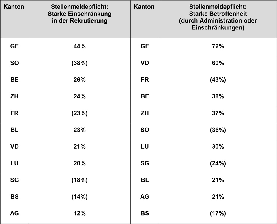 Bemerkungen: Die Tabelle zeigt den Anteil stark eingeschränkter bzw. betroffener Unternehmen durch die Stellenmeldepflicht. Kantone mit weniger als 20 Beobachtungen wurden weggelassen. Kantone mit weniger als 40 Beobachtungen sind in Klammern gesetzt. Quellen: swissstaffing, gfs-zürich, 2019.