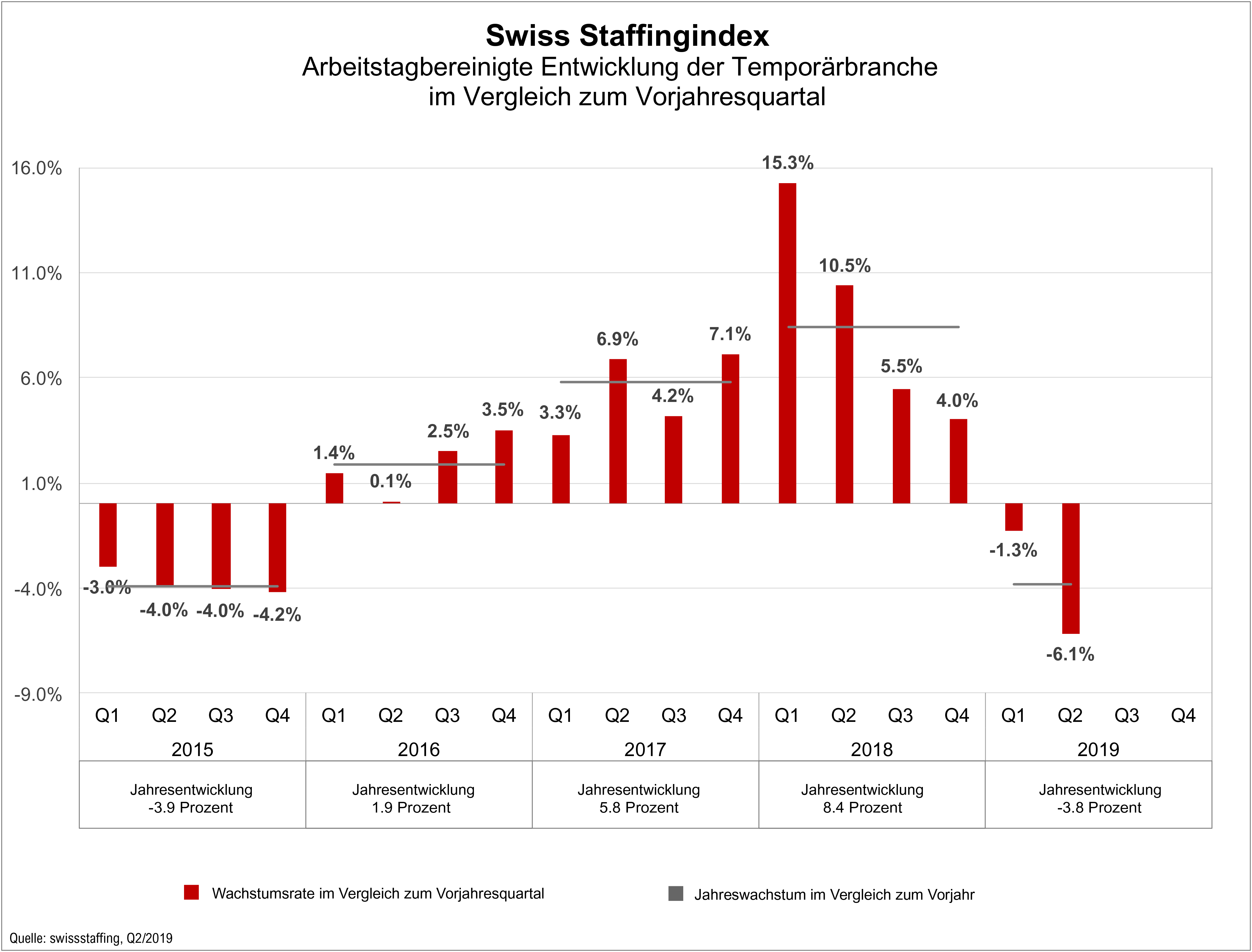 Die Temporärbranche schrumpft, obwohl die Schweizer Wirtschaft mit reduziertem Tempo wächst. Marius Osterfeld, Ökonom bei swissstaffing, erläutert: «Unternehmen greifen oft bei Personalspitzen auf Temporärarbeit zurück. Bei geringerem Wachstum werden Aufträge zunehmend mit dem Stammpersonal bewältigt. Gleichzeitig werden bei Personalbedarf bestehende Temporärstellen in Feststellen umgewandelt, aber keine neuen Temporärarbeitenden eingesetzt.» Der Blick in die Zukunft ist dennoch optimistisch. Derzeit deuten die Konjunkturprognosen auf eine kurze wirtschaftliche Schwächephase hin und nicht auf einen langfristigen wirtschaftlichen Abschwung.