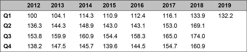 Die Index-Entwicklung des Swiss Staffingindex in der Übersicht, Basis: Q1 2012