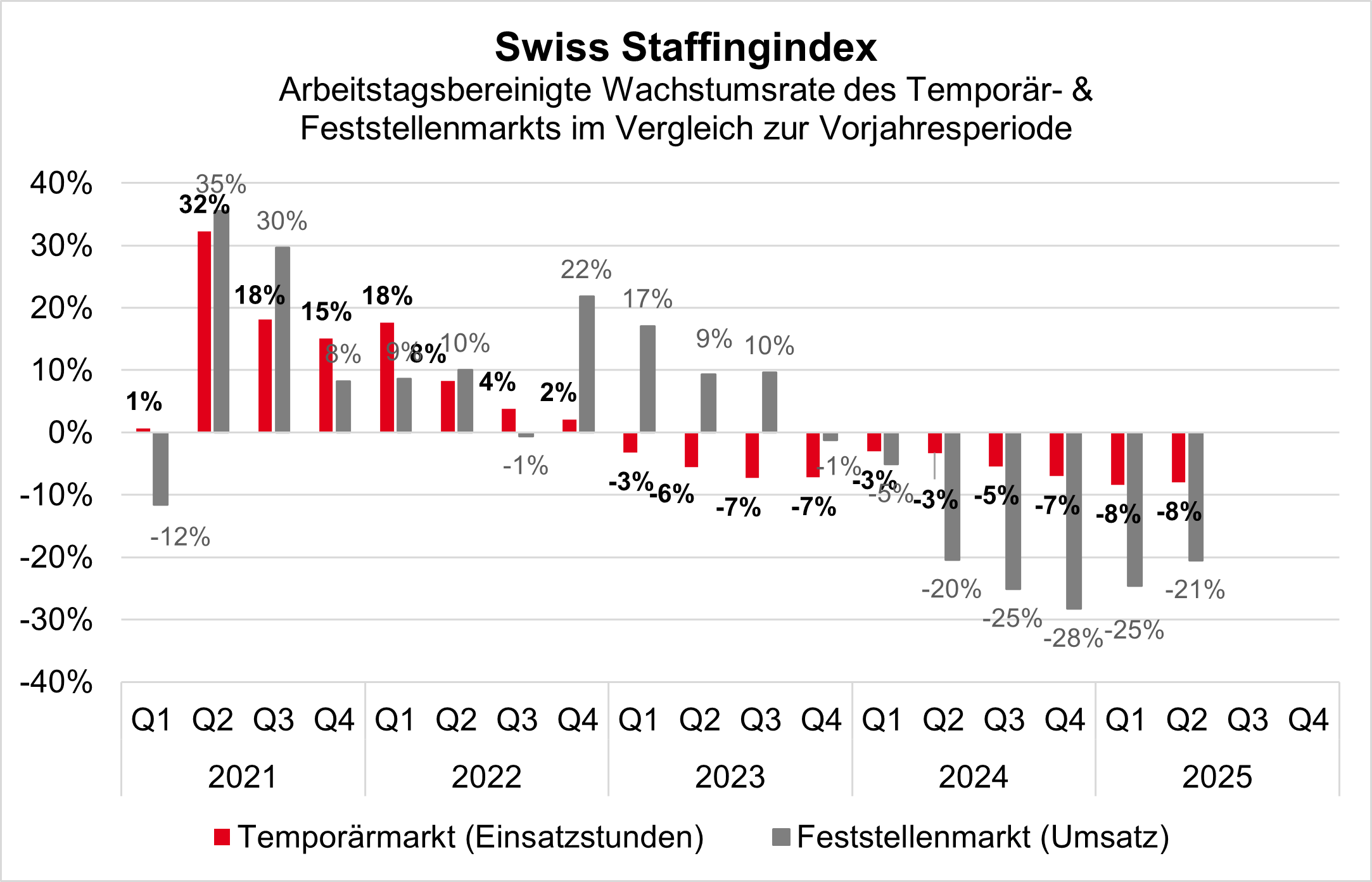Im dritten Jahr in Folge schliessen die Personaldienstleister das erste Halbjahr mit roten Zahlen ab. Die geleisteten Einsatzstunden der Temporärarbeitenden sanken im ersten Halbjahr um 8,8 Prozent. Der Feststellenmarkt brach gegenüber dem Vorjahr um 22,8 Prozent ein. Im Vergleich mit den Vorjahren hat sich der Abwärtstrend in beiden Teilmärkten beschleunigt. Die Personaldienstleister leiden unter der weltweiten Abkühlung der Konjunktur. Insbesondere die gestiegene wirtschaftliche Unsicherheit belastet Investitionen und Arbeitsmarkt.