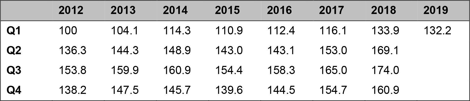 Overview of the development of the Swiss Staffingindex, basis: Q1 2012
