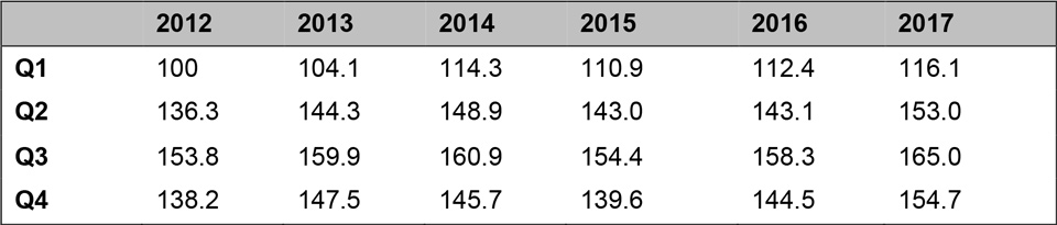 Overview of the development of the Swiss Staffingindex (basis: Q1 2012)