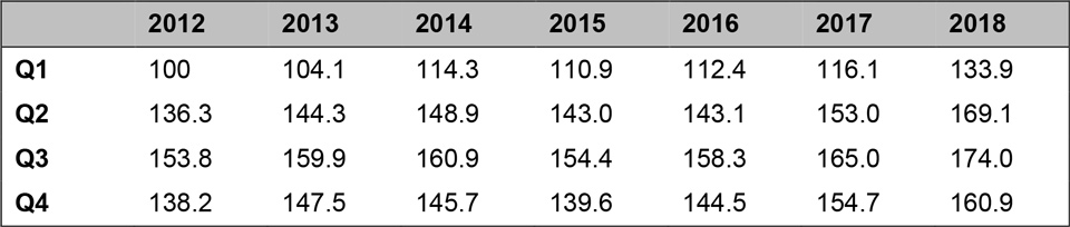 Overview of the development of the Swiss Staffingindex, basis: Q1 2012