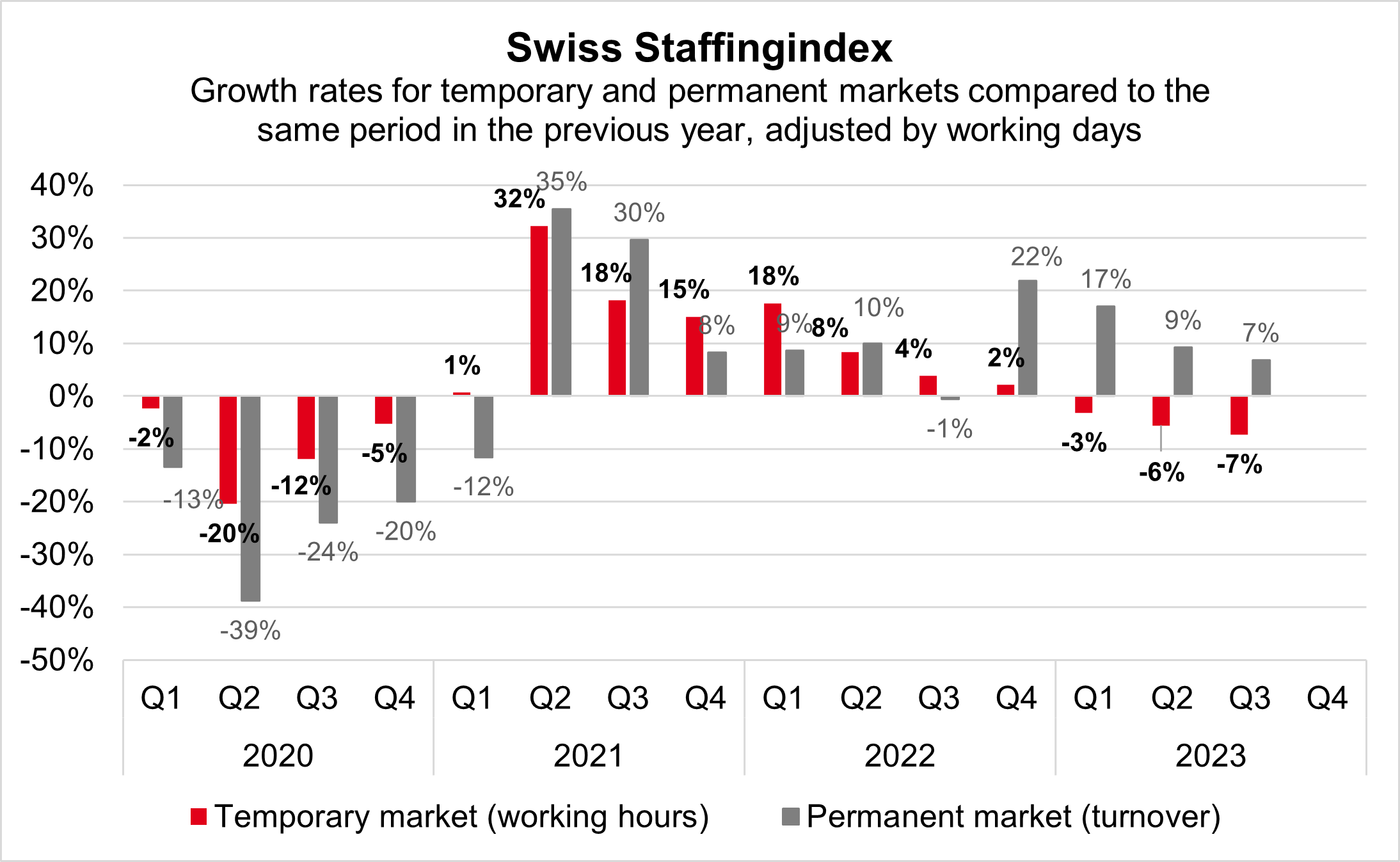 Staffing service providers concluded the third quarter of 2023 with a 7.6 percent decrease in temporary staffing compared to the previous year, according to the Swiss Staffingindex. The revenue with permanent positions, on the other hand, increased 6.8 percent. The combination of labor shortages and a slowing economy has made life difficult for staff leasing companies. There are no suitable candidates to fill vacancies. Order volumes in the industry are decreasing, and with them, the demand for temporary workers. However, business is running smoothly for permanent positions. Due to the dried-up labor market, companies lacking skilled workers are seeking assistance from staff leasing providers, which is boosting turnover.