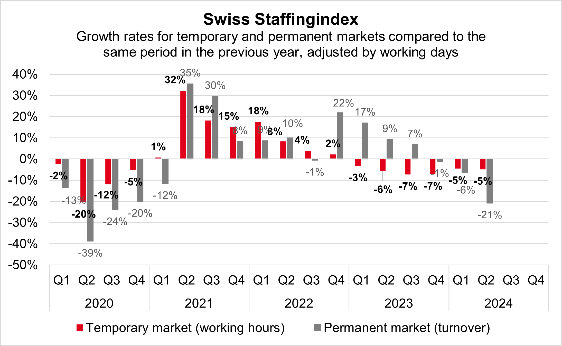 The faltering economy is making it hard to find jobs in Switzerland and resulting in lower financial figures for staffing service providers. The strength and speed of the new trend are particularly surprising in the permanent staffing sector, which has recorded a 20.8 percent fall in turnover year-on-year. Working hours in the temporary staffing market have also fallen by 4.9 percent - a significant reduction. This decline in both areas indicates an economic downturn. Companies are hesitant to create permanent positions due to thinner order books and require fewer temporary workers. In the healthcare sector, the demand for staff is continuing to grow.