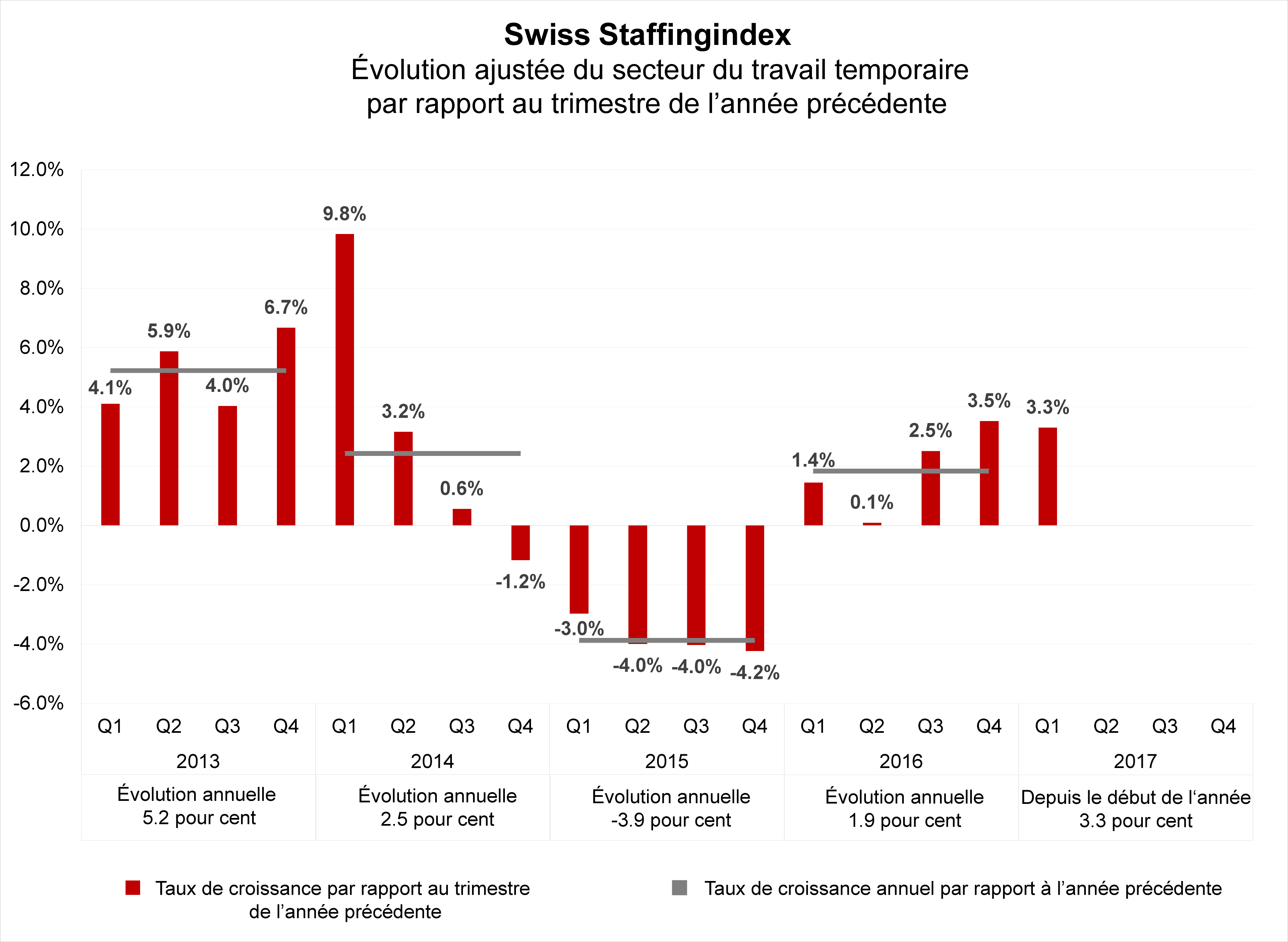 Les entreprises suisses de travail temporaire ont placé 1,9 % d'heures de travail supplémentaires en 2016. C'est ce qu'indique le nouveau Swiss Staffingindex lancé par l'association des services suisses de l'emploi swissstaffing. Il recense les chiffres commerciaux d'environ 200 entreprises suisses de travail temporaire. Avec 3,3 % d'heures de travail supplémentaires au premier trimestre 2017, le Swiss Staffingindex révèle une nouvelle accélération de l'économie suisse.